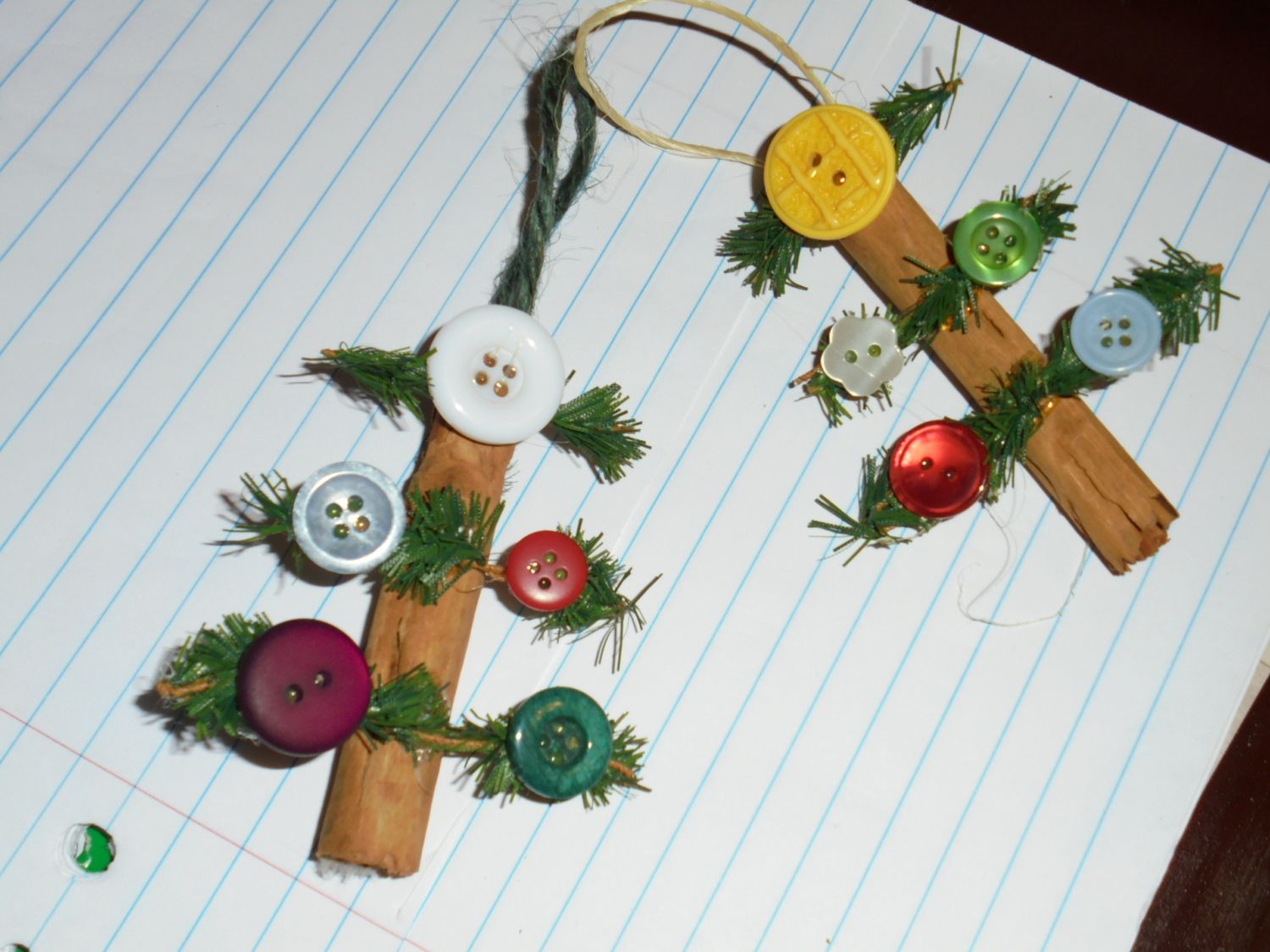They're little Christmas trees made with cinnamon sticks, bits of evergreen garland, twine (holder) and buttons. One of the rare times I actually already had all the pieces to make something. Easy to do (other than the hot glue gun...always burn myself with that). I made 4 of them in about 30 minutes.