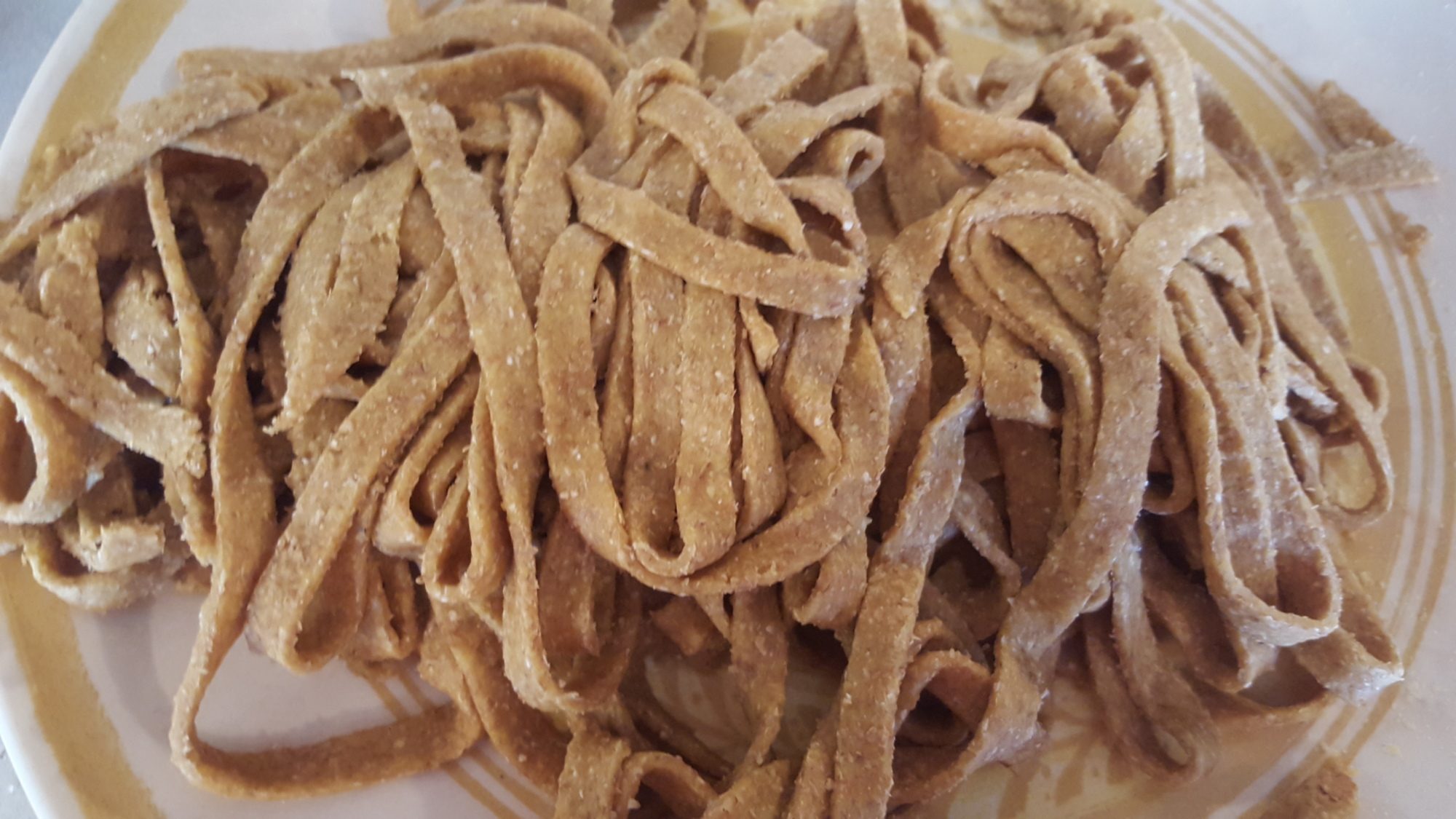 . Took me about an hour to make the noodles. It would have been quicker, but the recipe came out to dry (I think the eggs I had were not as big as recipe wanted). That and thing 1 and 2 were desperate to help.