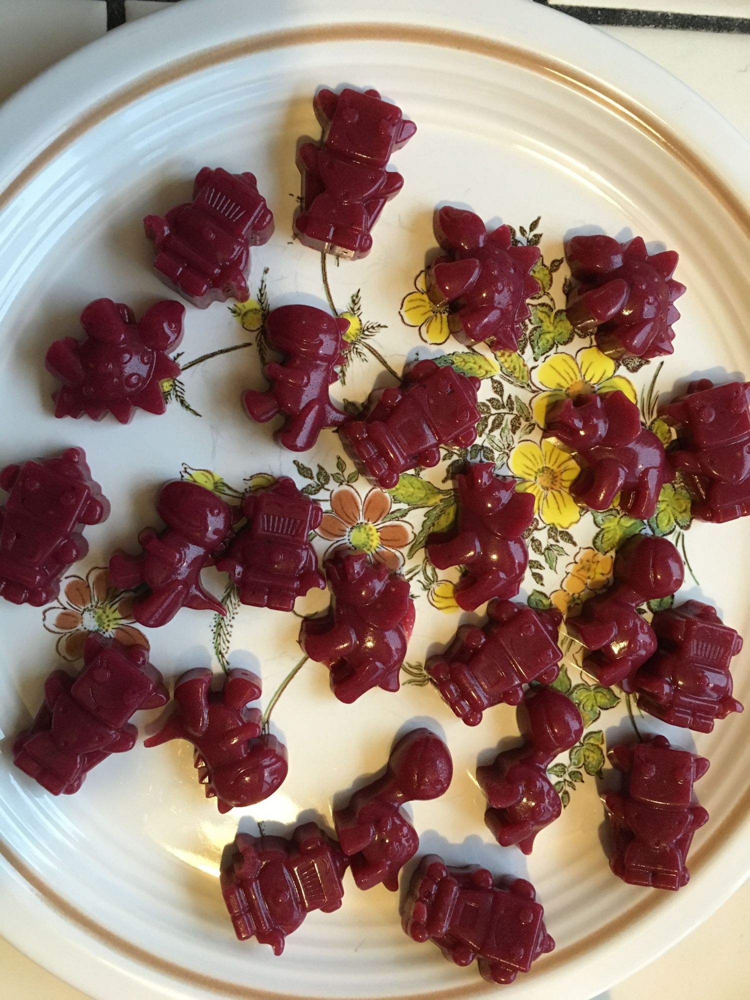 Home made gummies. The recipe made way more, but I'm just posting the cute ones I had molds for. The rest are just round from little round ice cube trays. They are not as hard as gummies from the store, but my son likes them. The recipe makes a lot, so be aware of that!