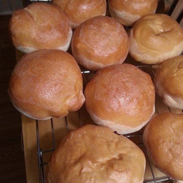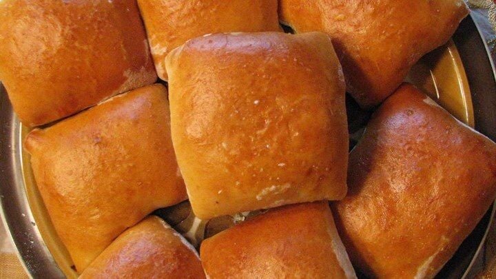 Roll each bread piece out into a 5" square. Using a slotted spoon to scoop mixture (you don't want them soggy) Place about a 1/3 cup of filling into each square. Bring up sides and pinch together. Place seam-side down on a greased baking sheet and allow to rise 10 minutes. Bake kraut burgers in preheated oven for 20 minutes or until golden brown. Remove from oven and immediately brush kraut burgers with melted butter.