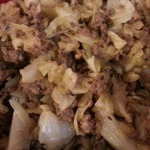 Saute onion in a bit of oil until just translucent. Add hamburger and saute until no longer pink. Season with salt and pepper. Drain away the grease, and return to the pan. Cover the mixture with the shredded cabbage and cook until the cabbage is done. Stir occasionally.