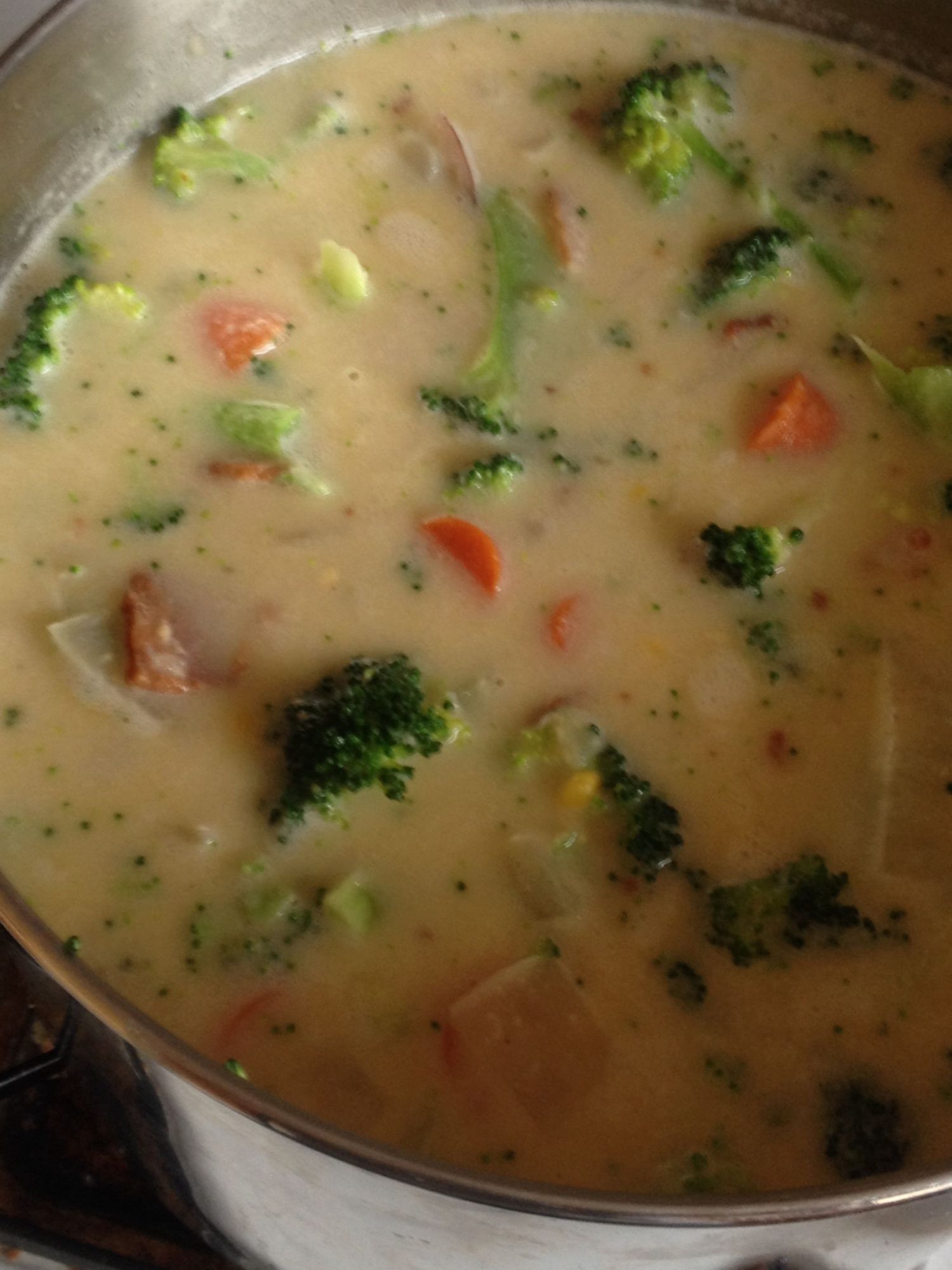 Today I got a baking/ cooking bug. I think I caught it last night. lol. For lunch I made challah bread and what we use to call veggie chowder growing up. Although it has bacon in it, so I feel the name is a misrepresentation.It's a chowder with corn, broccoli, potatoes onions, carrots, cheddar cheese and yes, bacon. I made a big pot so we can have it for dinner. It turned out really yummy and the challah bread goes great with it!![]()