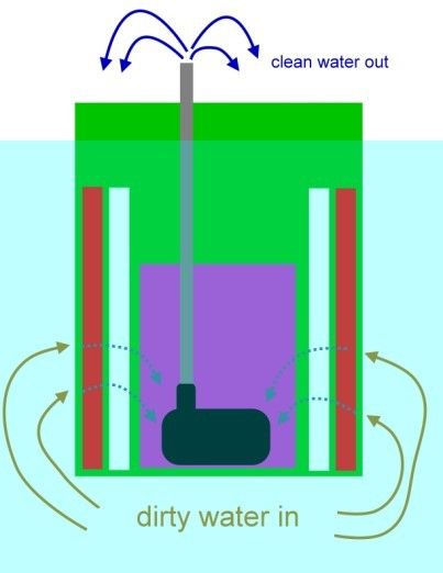 Hope that makes sense the buckets will fill with water and the pump will empty it drawing water through the buffer pads that will filter it... The pads can be taken out every whatever and hosed off and put back in...