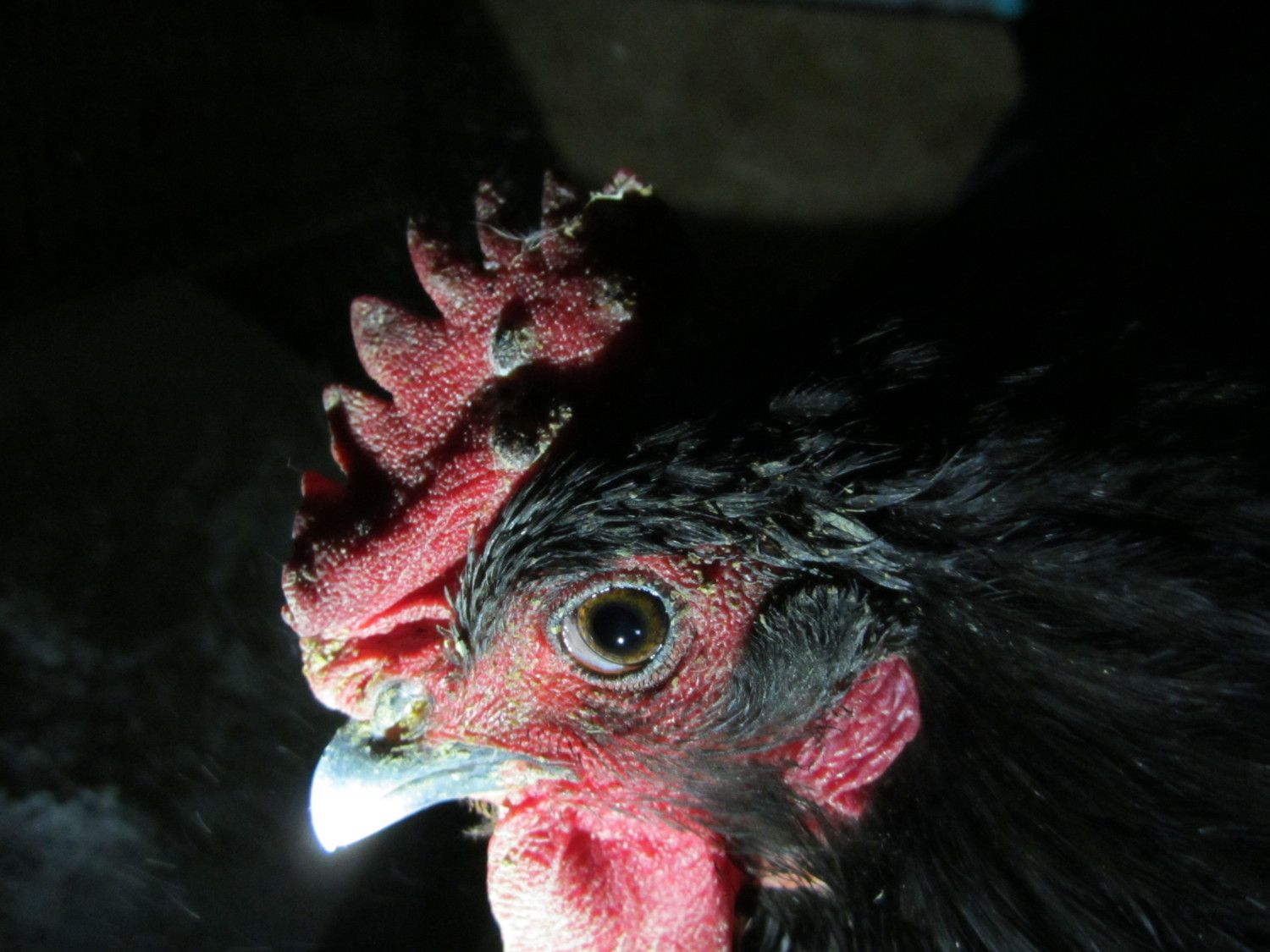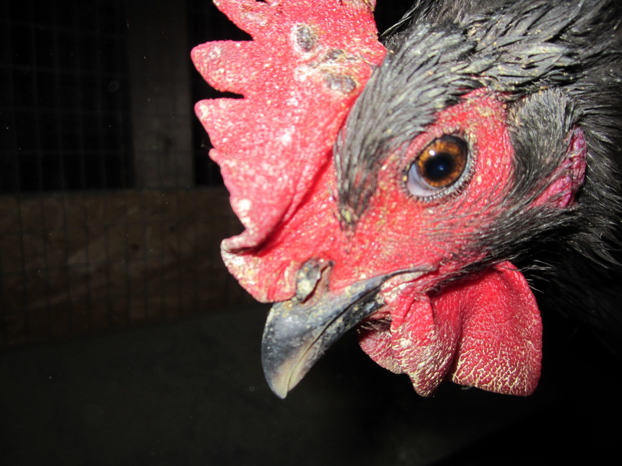 pics at night in the coop,the yellow is the Meds.....no discharge or smell,just black warts,etc..