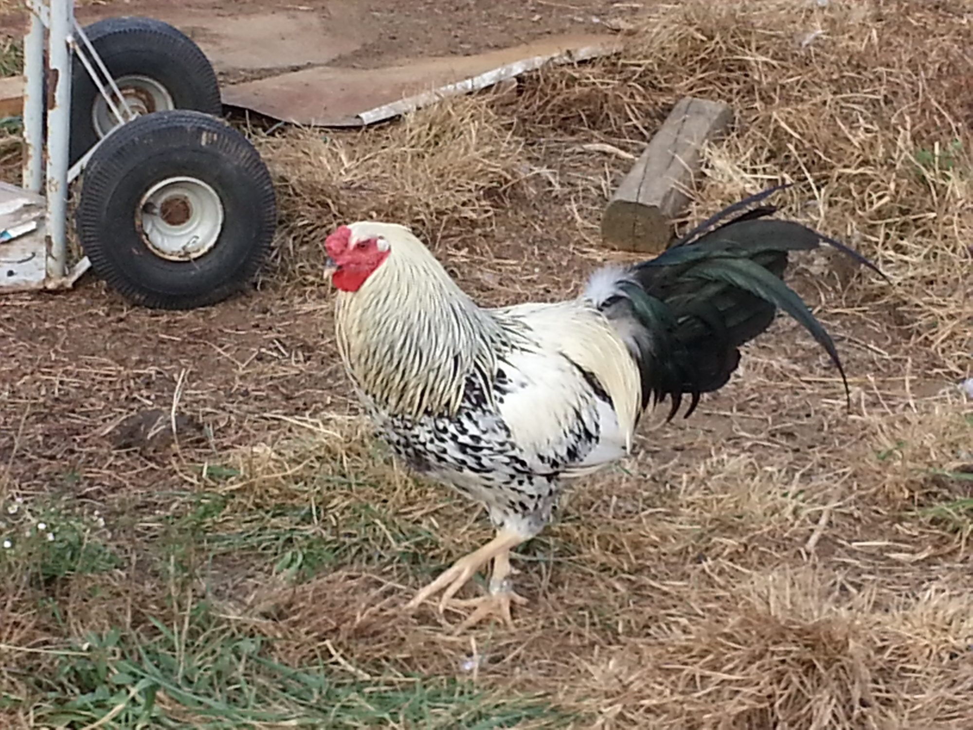 This roo was hatched with some silver laced orpington eggs. The others that hatched looked like just what they were supposed to but this guy "Romeo" only has the color of the other hatchlings. I think its an orpington (misp I know) mixed with a game bird any other suggestions? He is so pretty and we are going to breed him back to some English blacks.