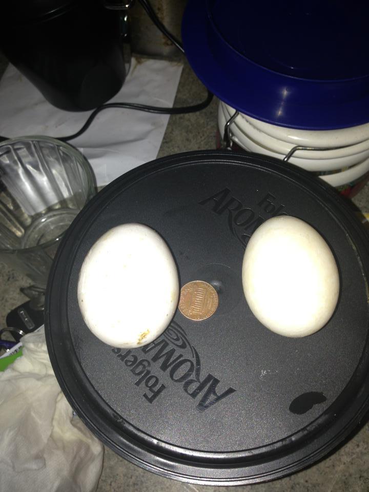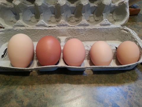 Our 1st. 2 girls that started laying middle of January eggs are on left and getting bigger and bigger! Next 2 are from girls that started Feb 10th and 23rd. Last one is from Dolly who layed her 1st egg yesterday This is her 2nd. All before 10 am! Only girl that hasn't laid today is Lilly, she's later in the day but she's the one whos been laying the soft shelled one...