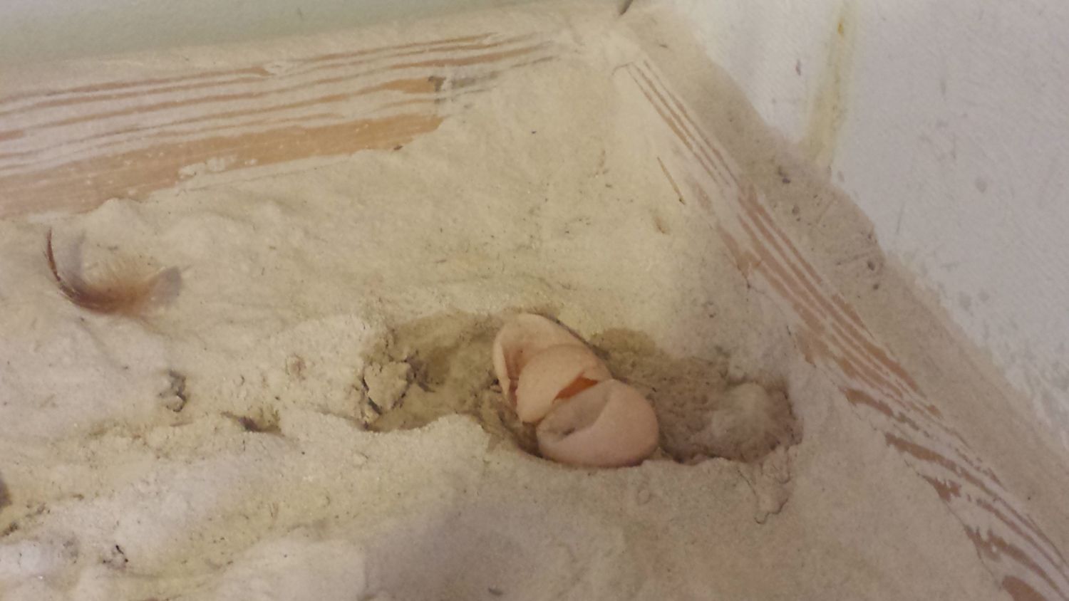 She had been squatting for a couple days and her comb and wattles are quite red, so I knew she would be first. Obviously her timing is a bit off given that she laid at around 10 PM, but hey, it was an egg! I found another egg in the poop box in "her" corner of the roost yesterday morning, so now she's laid two. The second one (pictured) also was broken but the shell seemed a bit harder than the first egg...that first one was more like just a membrane than a shell.