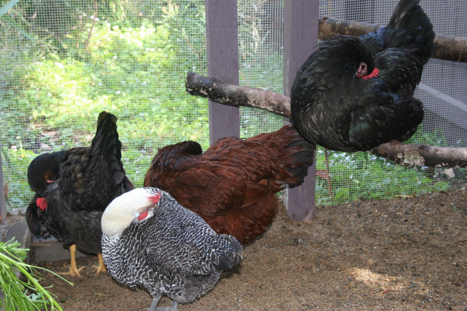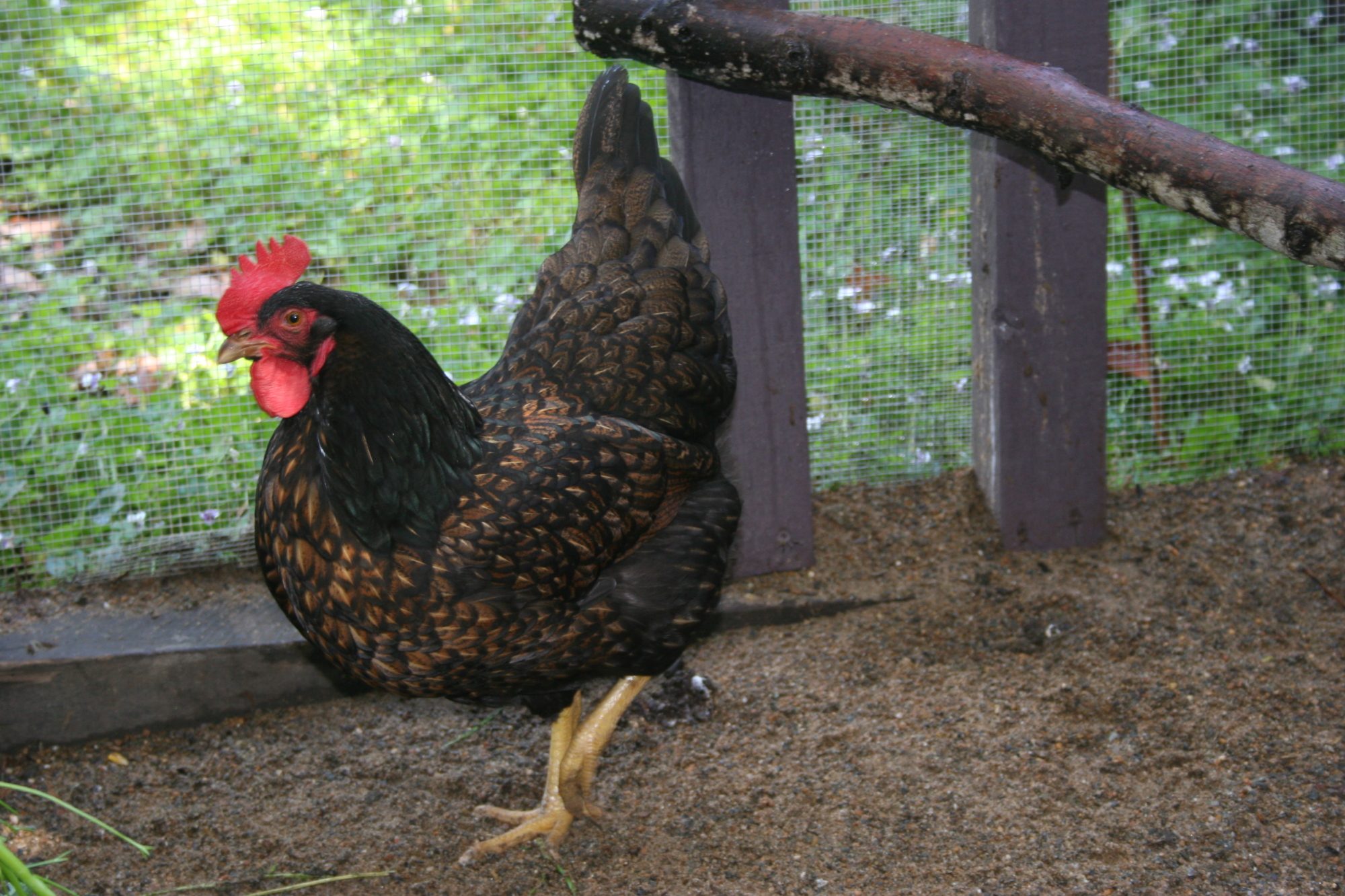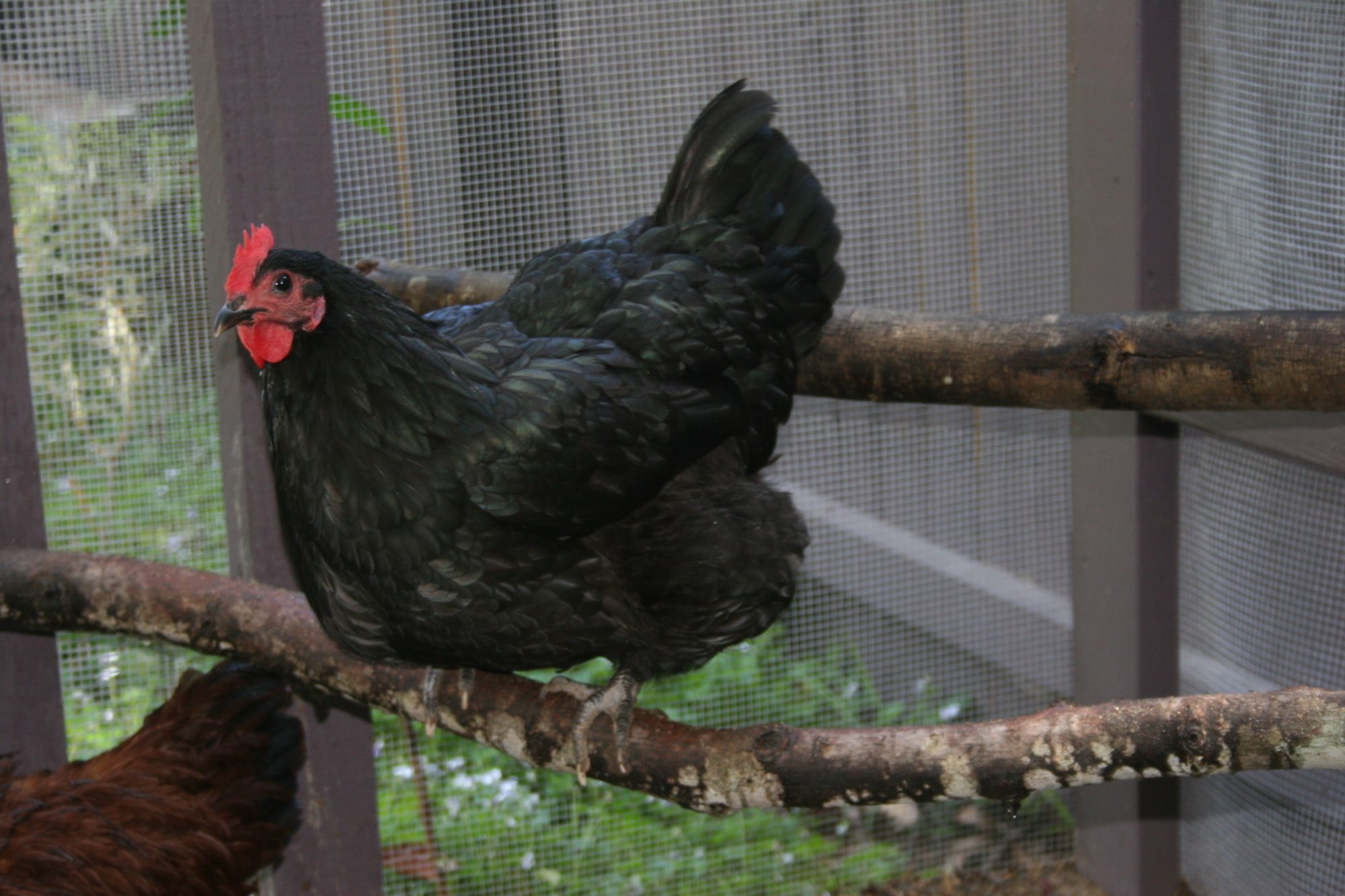 Matilda heading into the coop to lay her egg. The nest boxes are on the right, and of course as you can see.. roosts on the left.