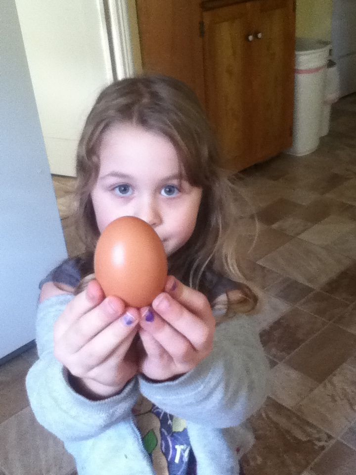 I wasn't even expecting anything, but my daughter wanted to check when we let the chickens out this afternoon. And there was a big beautiful brown egg in the nest box right next to the bright blue plastic easter egg. We were so excited. My daughter carried it around for quite a while and she kept going back to the frigde to check on it all evening. (My daughter's four, by the way.)