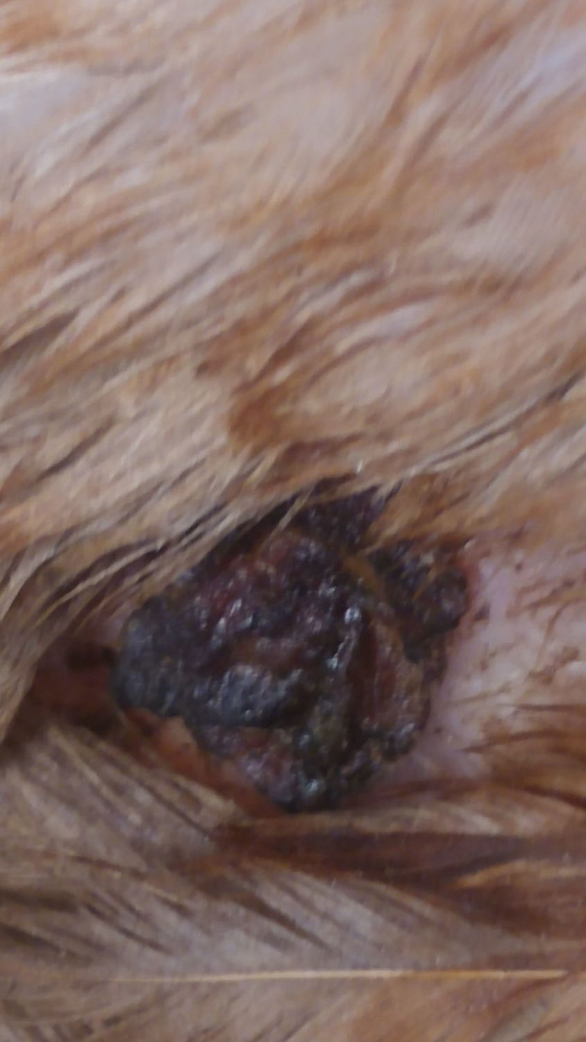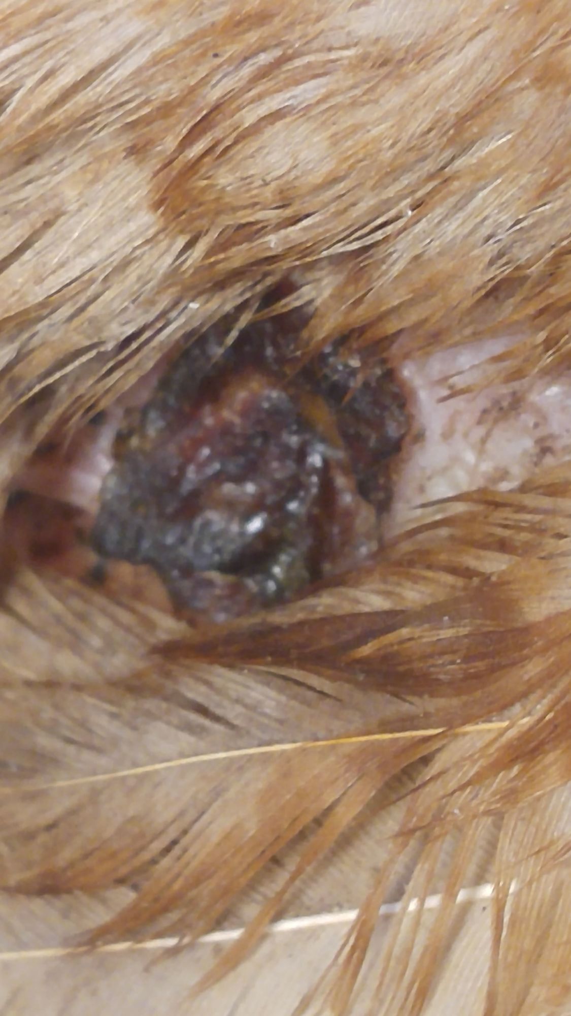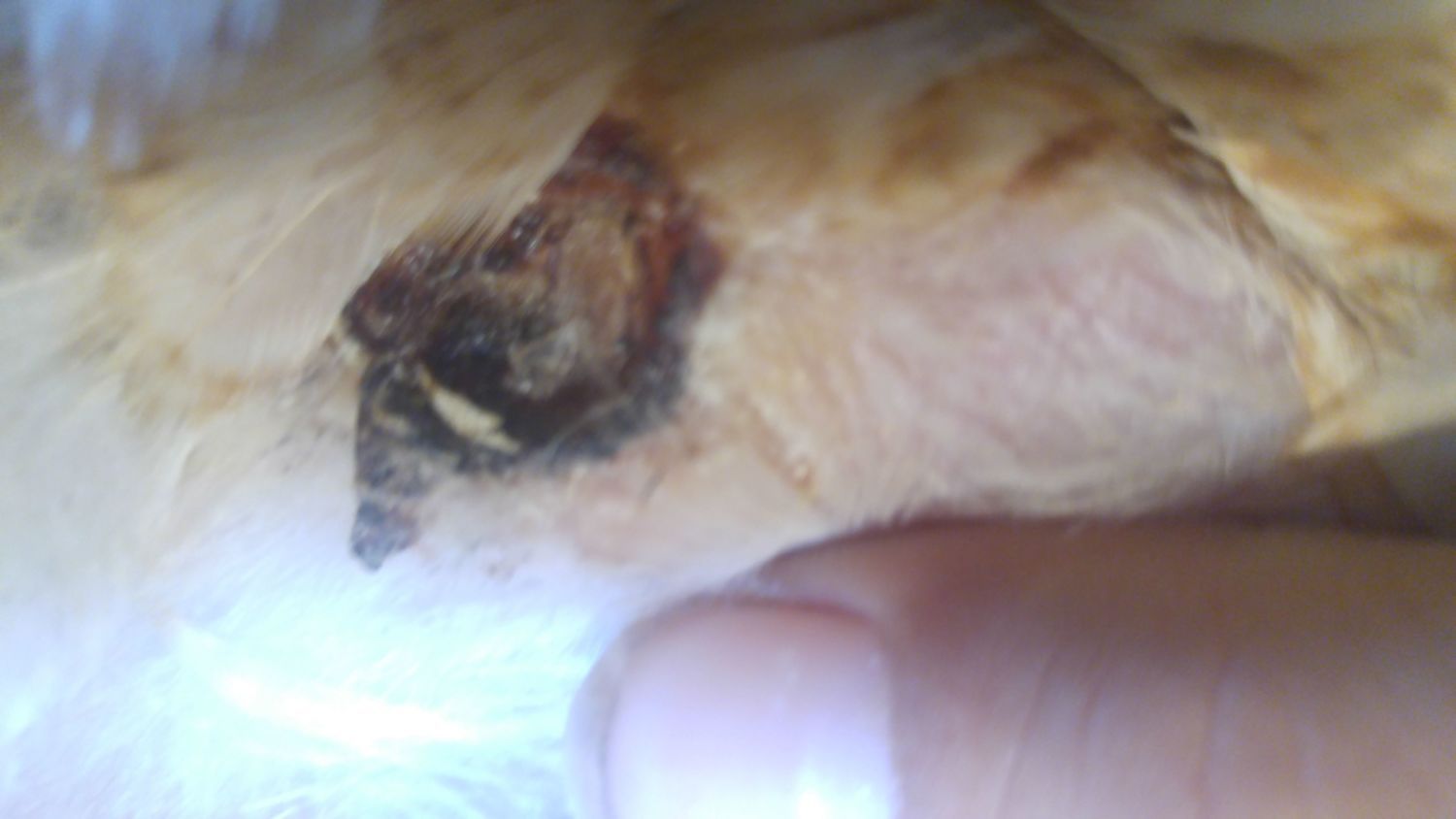 I've only had her for about 72 hours and have been treating her for about 36 now. the wound seems to have a nice scab and doesn't appear to be infected although it does look nasty and it's a litle oozy but I cleaned it and took the black skin off yesterday. it looks like a crater in her little fanny. I am also giving her some diluted oregano oil in her food. She's eating and drinking and begging for mealworms just fine. Even went for a "dust bath" today which resulted in my having to irrigate the heck out of the wound again.