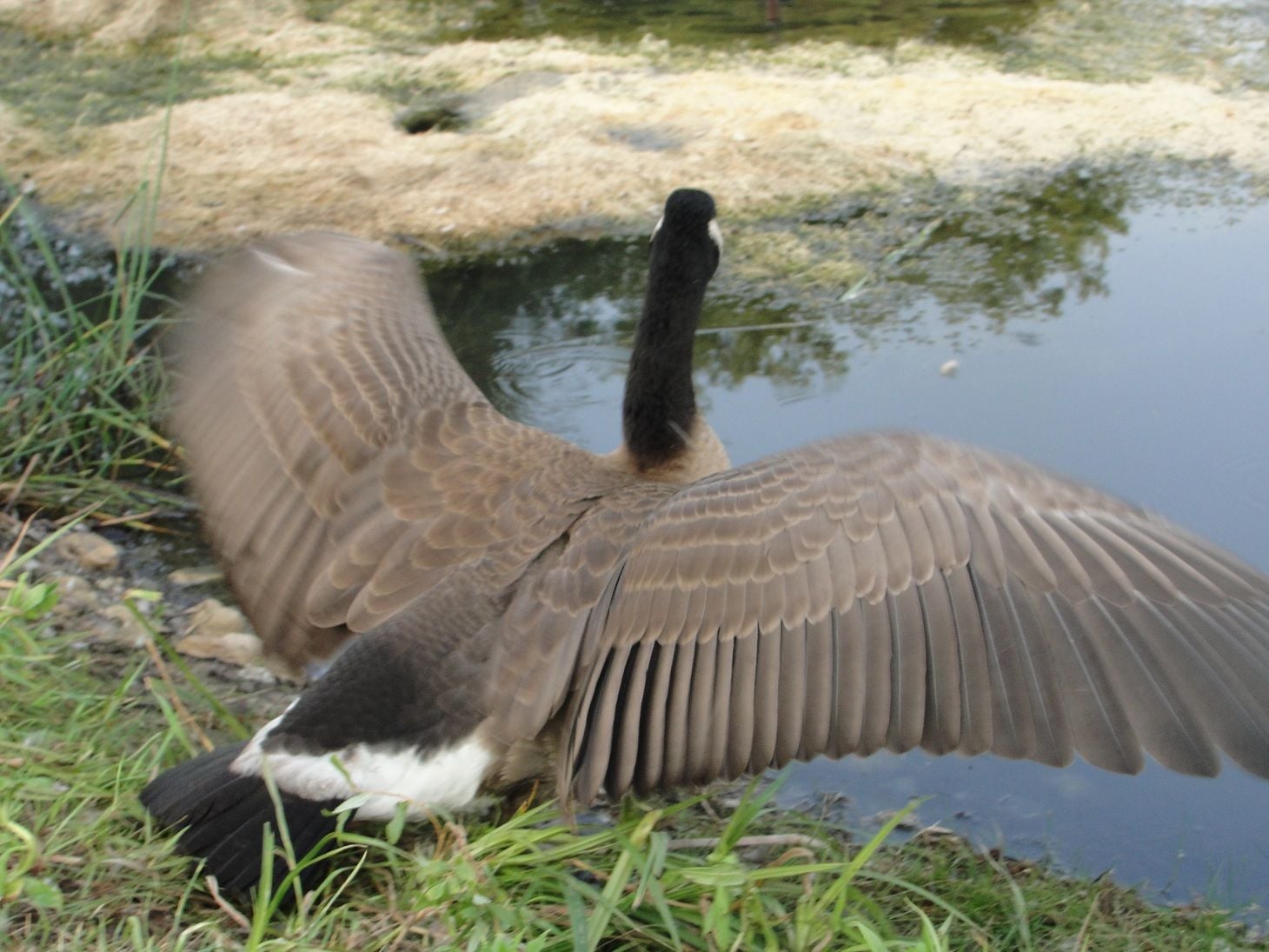 Did the original owner think its part domestic because it has a big white bar on its forehead? Most state game agencies require a "domesticated game bird breeders permit" which is in addition to the Fed "sale and disposal permit". If you only keep one bird and it is flighted it will eventually leave to find a mate. If it is a gander he will not likely ever come back. If it is a hen it may return with the new mate to nest (creating a situation nobody wants). During breeding season the tamest ganders can suddenly give you a heck of a beating. If you keep flighted pairs and they hatch and fledge young the whole family will eventually hit the road to explore and teach the goslings. One way or another, Canada's are best kept on the ground.