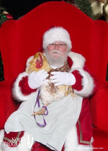 I took my rooster Duke to have his picture taken with Santa Claus last year, we went to the Mall on Pet day. The looks we got were great. Duke is a Red Star Rooster, and he is about 10 lbs, but of course he looks much bigger when you're not expecting a chicken!