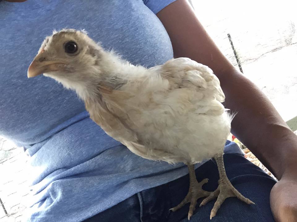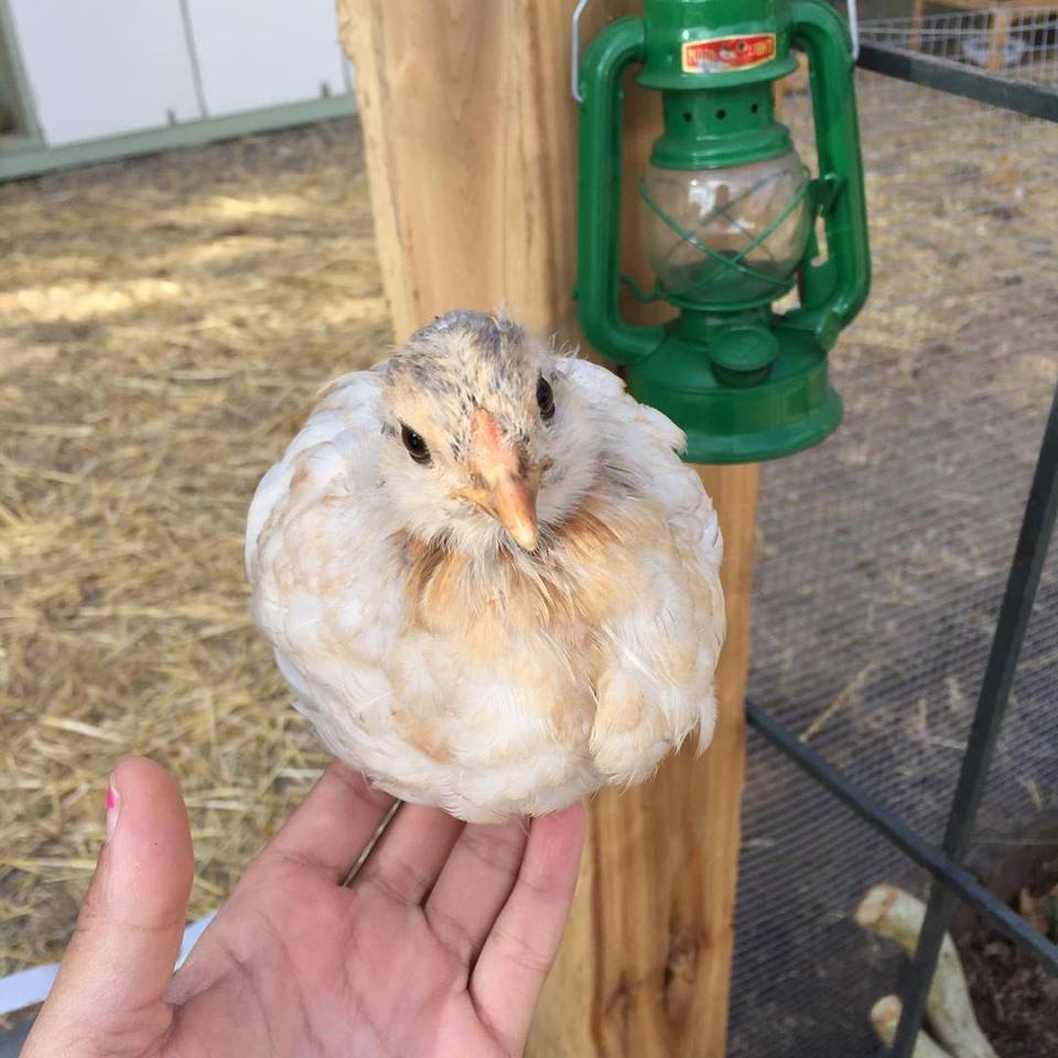 I rescued this poor little "guy", (not sure of the gender yet), from a creepy local feed store. He is super sweet and thinks I'm his momma! hehe. I took him because all of his back feathers were ripped out and he was bleeding pretty bad. He looked so miserable and kept pacing back and forth in his cage. When I took him home, I kept him in "quarantine" in a smaller coop, for a couple days to heal, away from my "mean girl" golden sexlink pullets. I slowly introduced them, they pick on him every now and then, but he is really fast and can flutter up to his special living area above the hen boxes, where it's safe. They're slowly accepting him and now let him cuddle with them at night. He is so attached to me too! One day he just let me pick him up and ever since, he always follows me around and wants to be held and coddled.