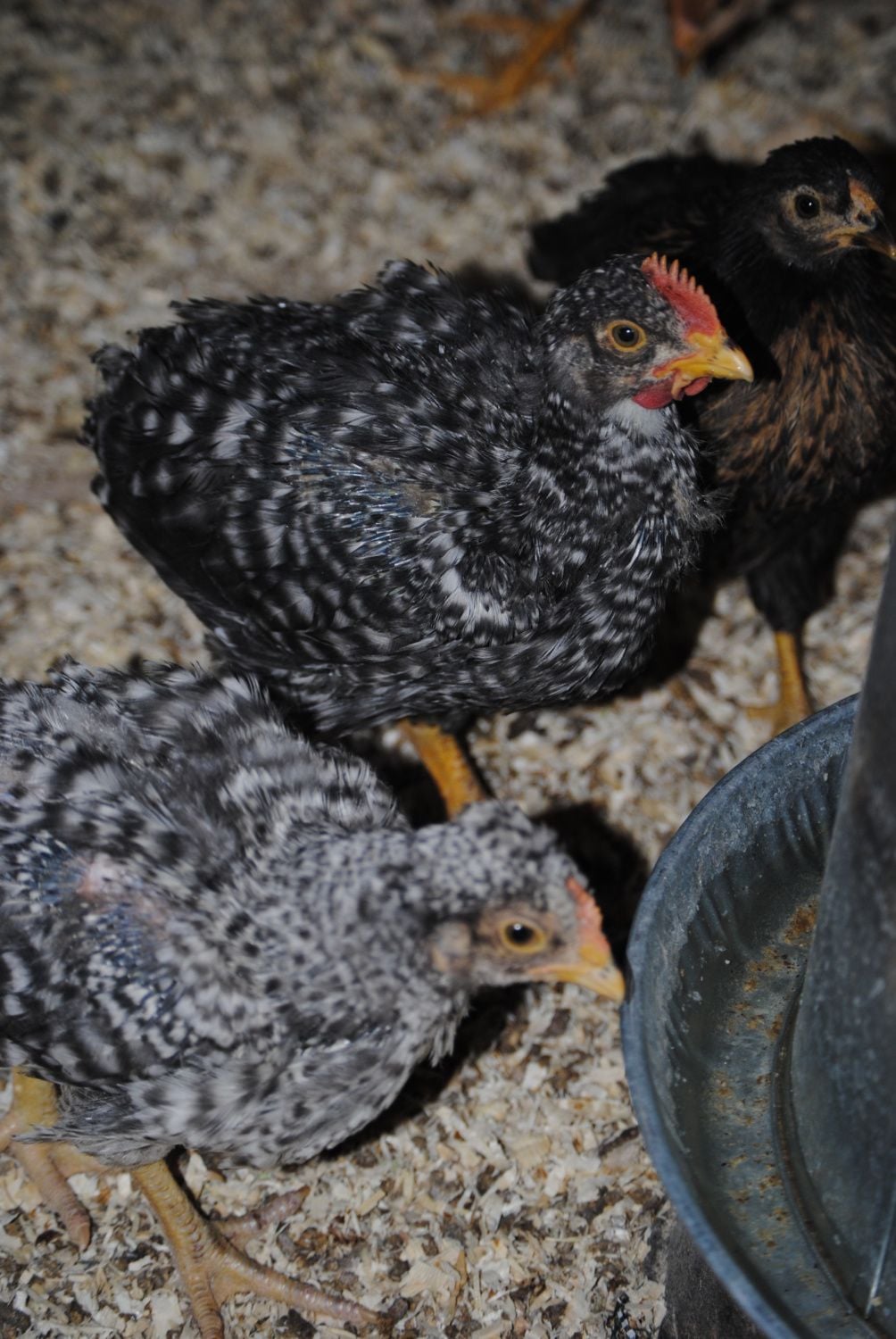 Here are my two new Barred Rocks, they are NOT pure...if they were, the lighter one would be the rooster, the darker, the hen. As it stands I don't know exactly what they are, I am guessing the darker is the roo based on leg size and large comb. These pictured are 5 weeks. How old is yours?