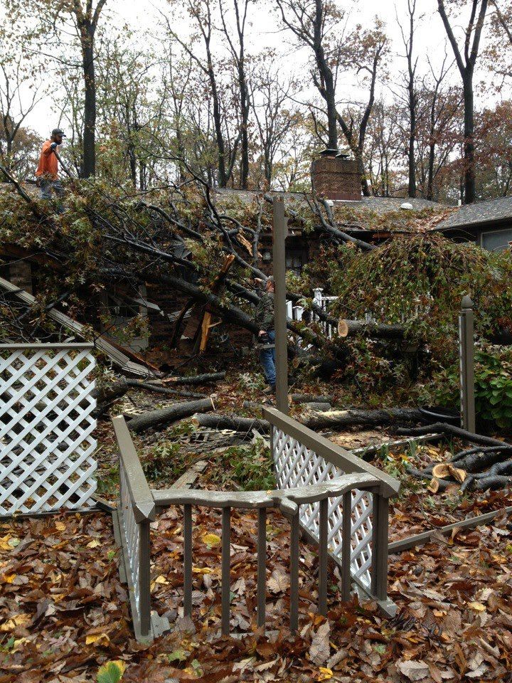 We're already making plans to have it cut down. Here are a few pictures from my grandmother's house. She was very lucky, She was standing at the kitchen window when this tree went down, and a branch was only about 6 inches from her. The first picture was where a huge trellis was that covered a brick patio, and you can barely make out the steps to the deck.