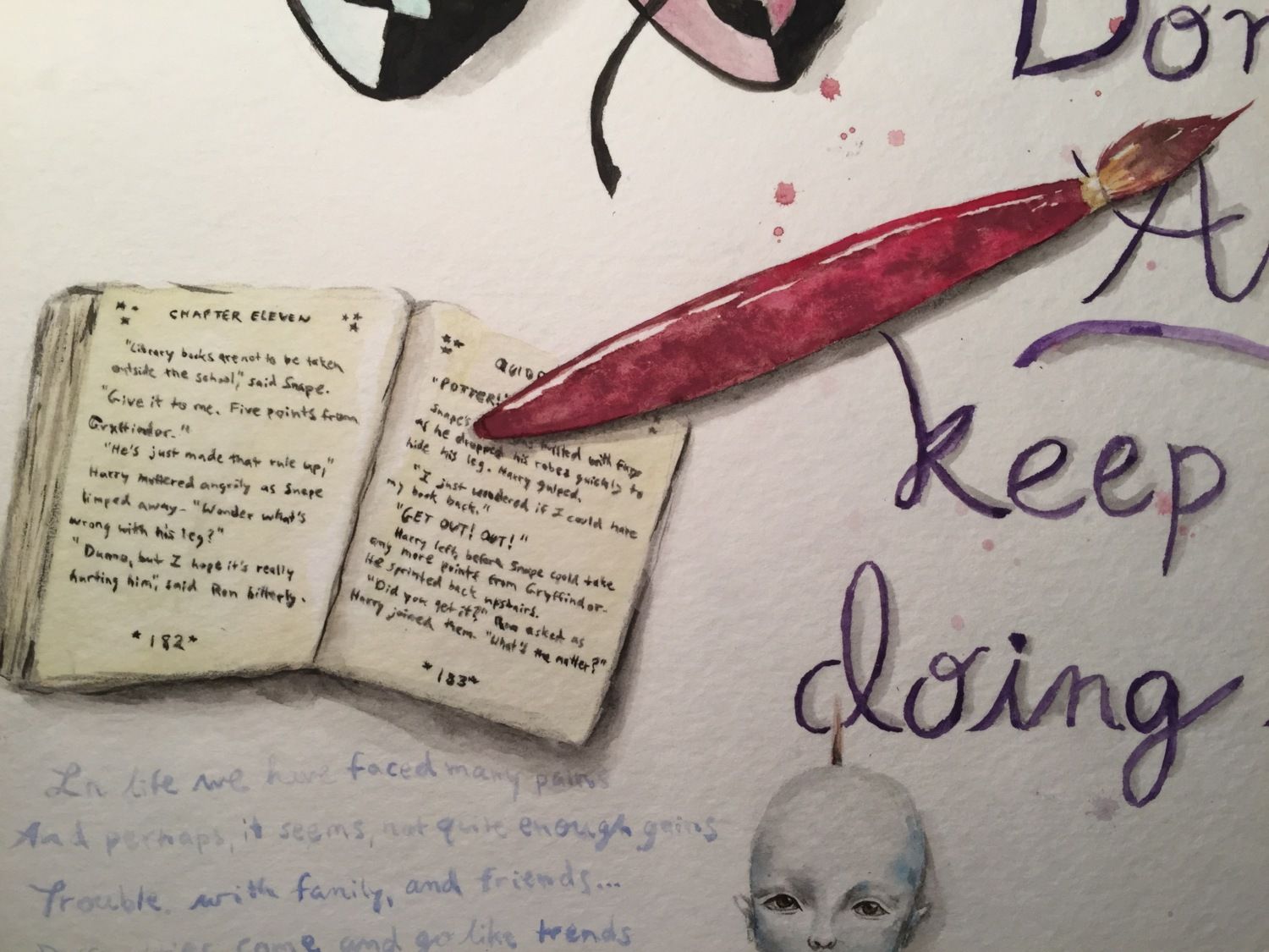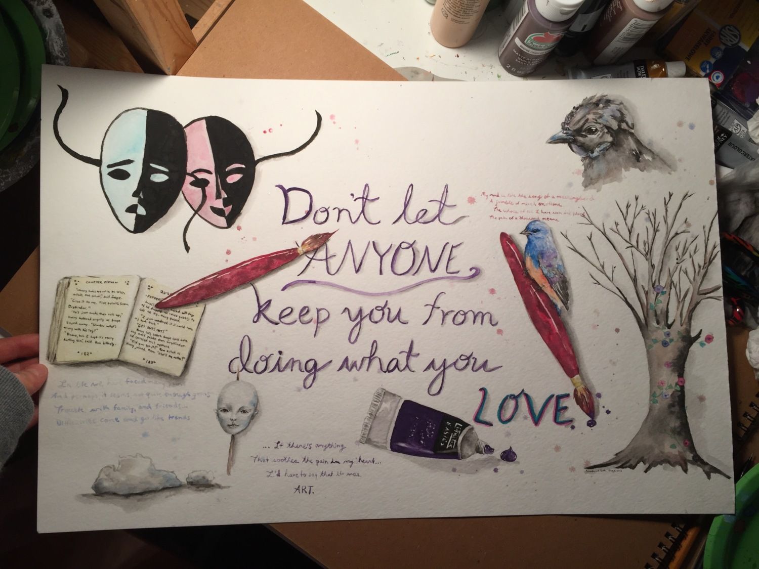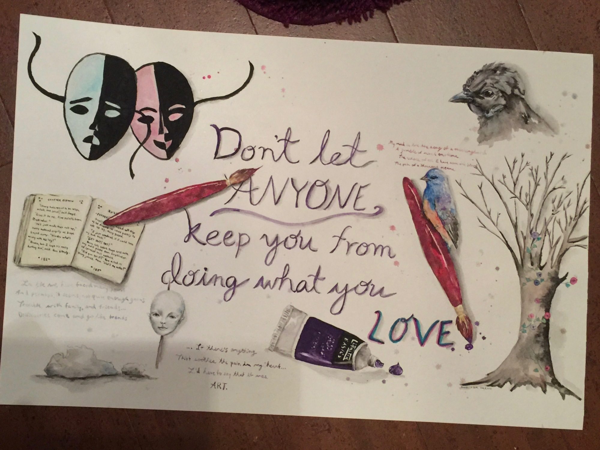 I have pretty low self-confidence and get really easily discouraged, so I figured this would be a bit of inspiration for me. I decorated the painting with things that I love: Painting, sculpting, reading (The writing on the book is actually from Harry Potter