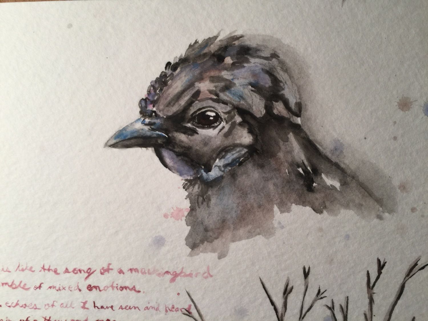 ), acting, nature, and my favorite hen Hopie who recently passed away. The small words are bits from some of the poems I've wrote