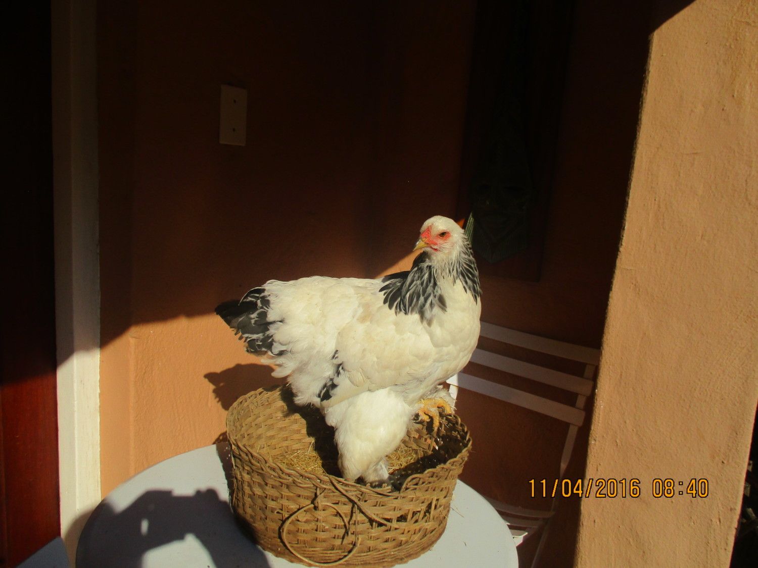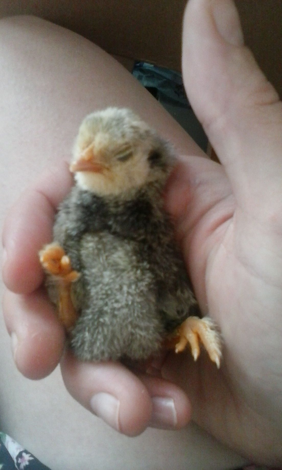 Dumpling, my Light Brahma chick. (See first page of https://www.backyardchickens.com/t/1092806/april-2016-chicken-show) BTW, Dumpling is a very big and FAT hen, who loves pizza.