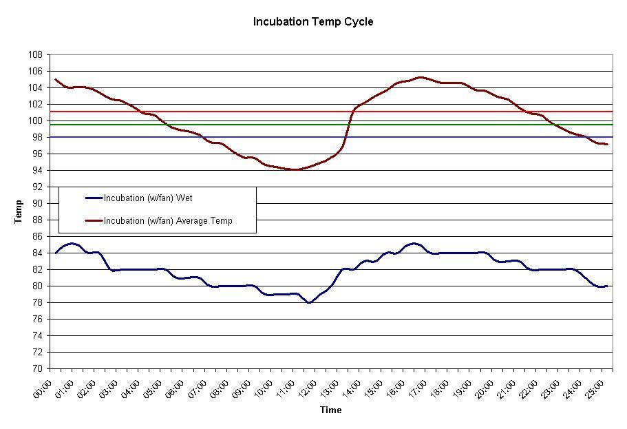 My incubator runs on about a 17 or 18 minute cycle. The temperature falls, the thermostat kicks on, the heating elements heat up, then the thermostat kicks off, the heating elements dissipate heat until they cool down, then when the incubator cools enough, the cycle starts over. You can see why this thing could drive me crazy. But I know the average temperature, and I know how long it is too hot, and how long it is too cold.