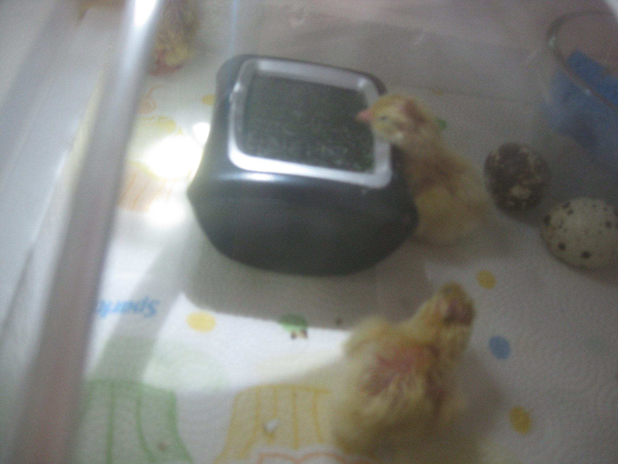 congrats!!!Came home from work and there were 4 chicks, freshly hatched. This photo shows them 3 hours old. On the photo, you can see three; one on the digital thermometer, one on the bottom right, and one in the corner top left. The last one hopped out of the photo at the last second. Mama tells me that as of this moment, there is another one starting to pip. I hope they all make it through the night.![]()