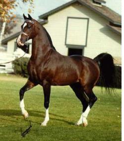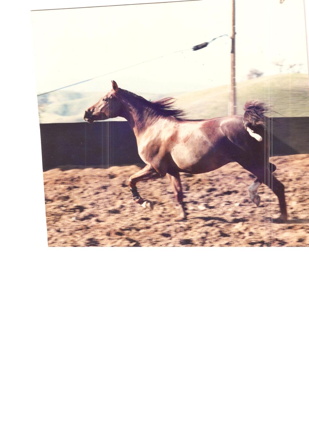 He was a typey horse with beautiful head and legs, but unfortunately his competition in the ring was Fortunate Son and other "East German swim horses" of that era, so he always looked so, well, puny in comparison. We showed him for about a year and then brought him home to the breeding barn where we were all much happier. He was a dream to handle in the breeding barn as he was a quick study for the phantom (breeding dummy for collecting for A.I.), would unfurl for cleaning if you whistled "My Country Tis of Thee" low and off-key, and would obey hand signals for breeding duties. He put the pretty on his foals and fabulous legs, but the mare's body type would show through. I sold him when he was 13 as I just wasn't using him for anything after the divorce and his new owners enjoyed showing him (halter and performance) and expanding his breeding circle. Teenagers would take him out for trail rides. He was smooth as butter to ride. Just a swell overall once in a lifetime horse. (And kind of a clown....definitely had a fun personality) He was my first and last horse of my equine career. I miss him.