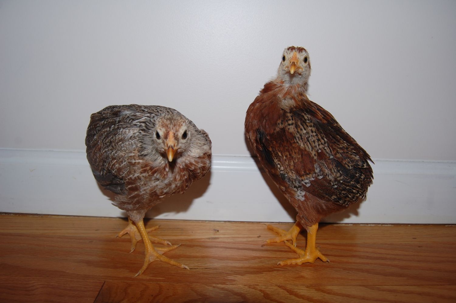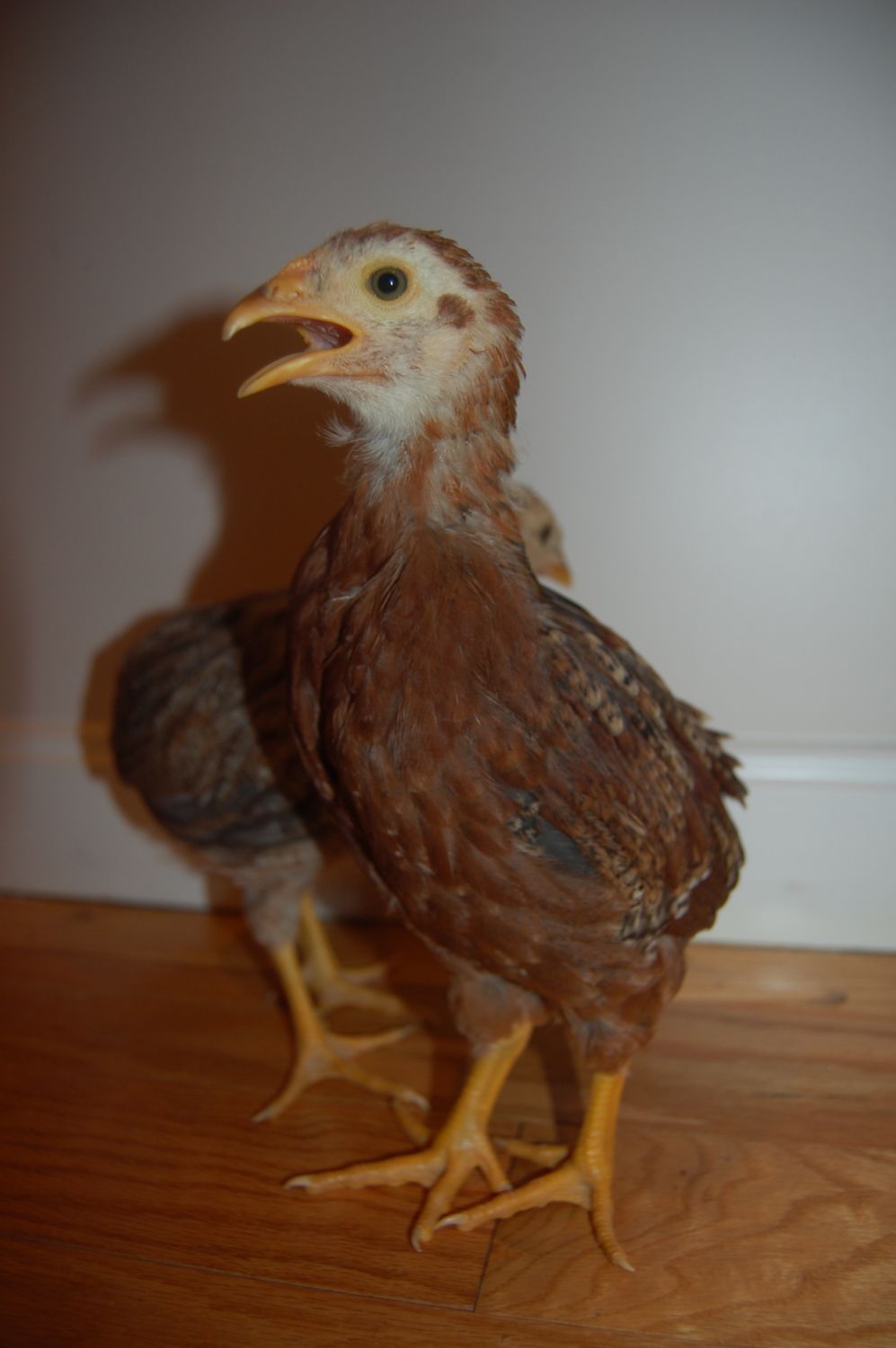 I am new to chickens, and by chance got eggs from Ramey from ebay. I've never had chickens, and these 5 week old Araucana chicks I have hatched have made me obsessed with the breed. I LOVELOVE LOVE the colors on these two chicks. I just think they are SO gorgeous, and their personalities are unbelievable, especially with my young kids. Anyway - I was hoping that someone could help me put a name to their coloring, and perhaps help me with sexing. The darker one, Broccoli, is a male I THINK. He is very calm, but the other possible roos choose him to spar with. And he has a bit (even though still small!) more comb than the other. The lighter color is Pip, who pecks at younger chicks but doesn't ever chest bump with the other suspected roos. Do you think I have my sexing right? Nobody crows yet, but the "males" voice is definitely different than the other. I want to get more to keep this coloring going, but I contacted him and he said he mixed up his experimental pens so he can't guarantee I'd get this color again. Again, I am new to this. Is this an easy color to find in Araucanas? I need MORE! THANKS!!![]()