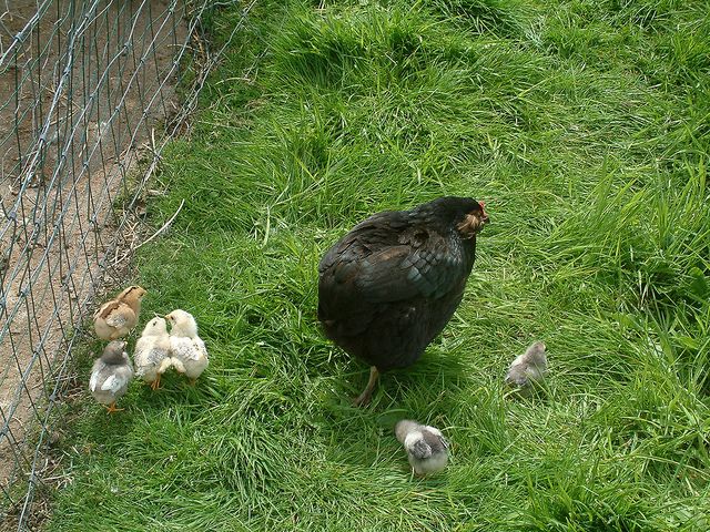 But anyway, latest pics of my Josephine and her clutch. She's been pretty good with them so far. I've got one tailed, the rest are rumpless. Today was the first rain in a while, so I had to save one stranded sopping chick before it truly perished alone. She's not the best about rounding up lost chicks.