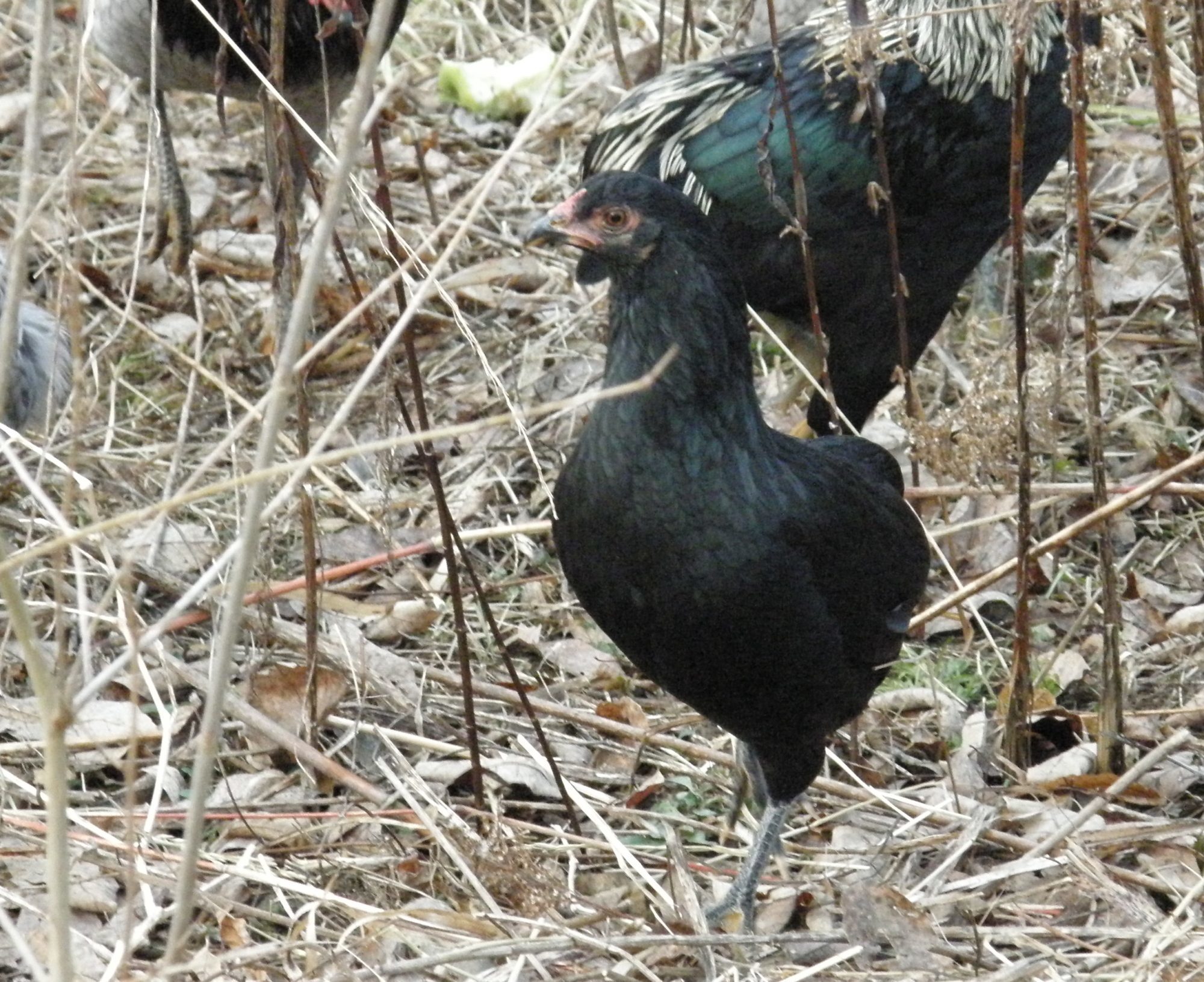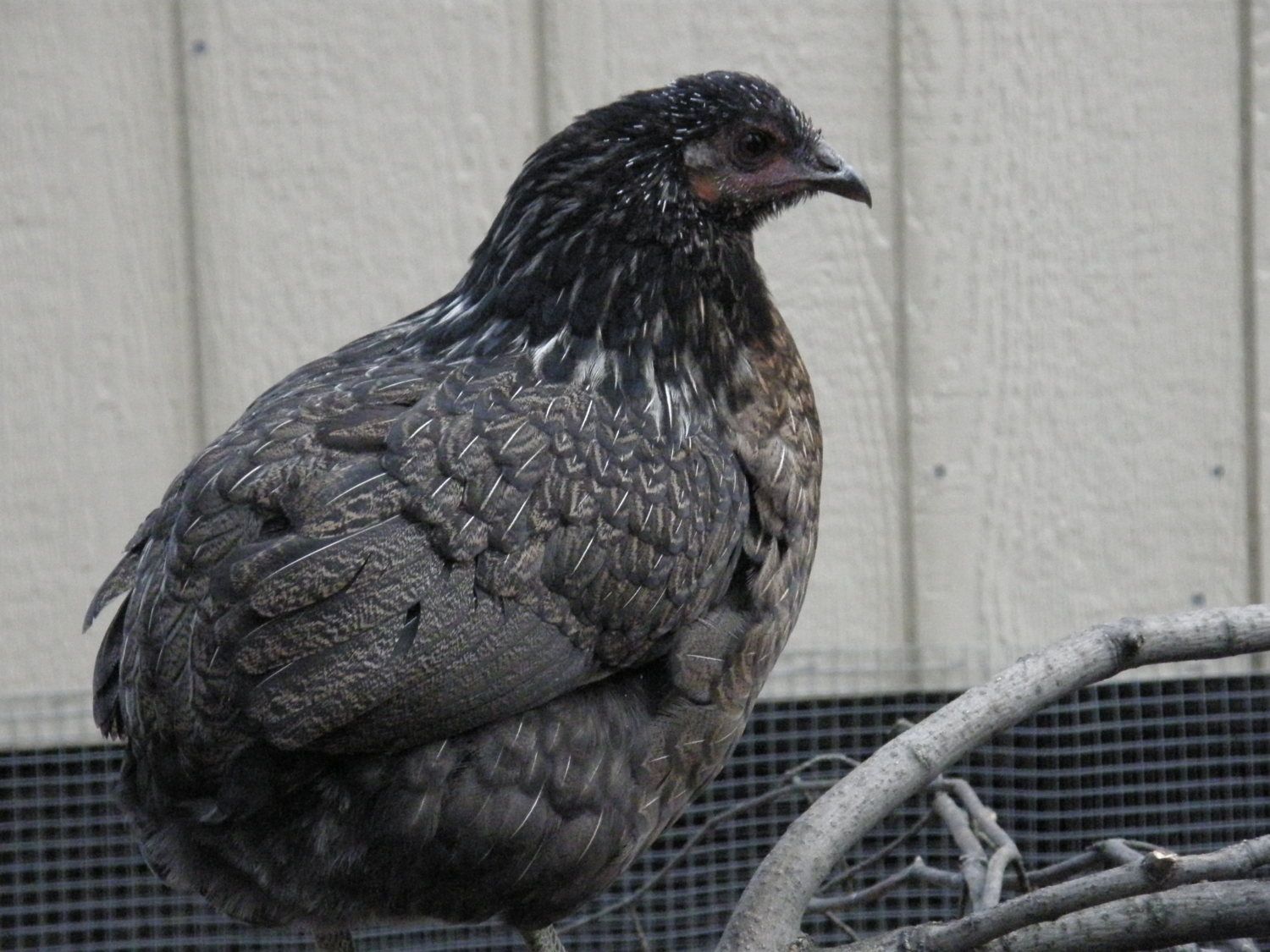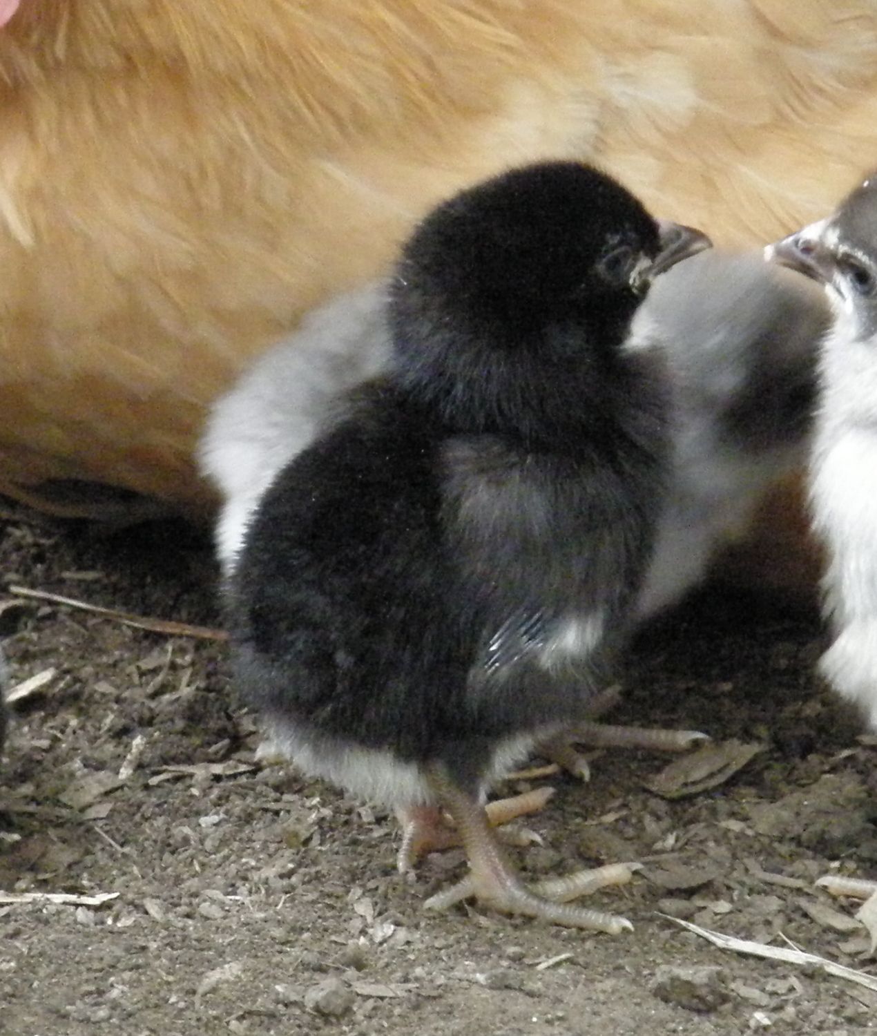 Magpie. Black (maybe split for mottled) clean-faced rumpless pullet. She's very black visually, but looks like she might have some patterning on her feathers.
