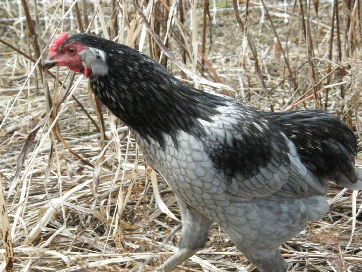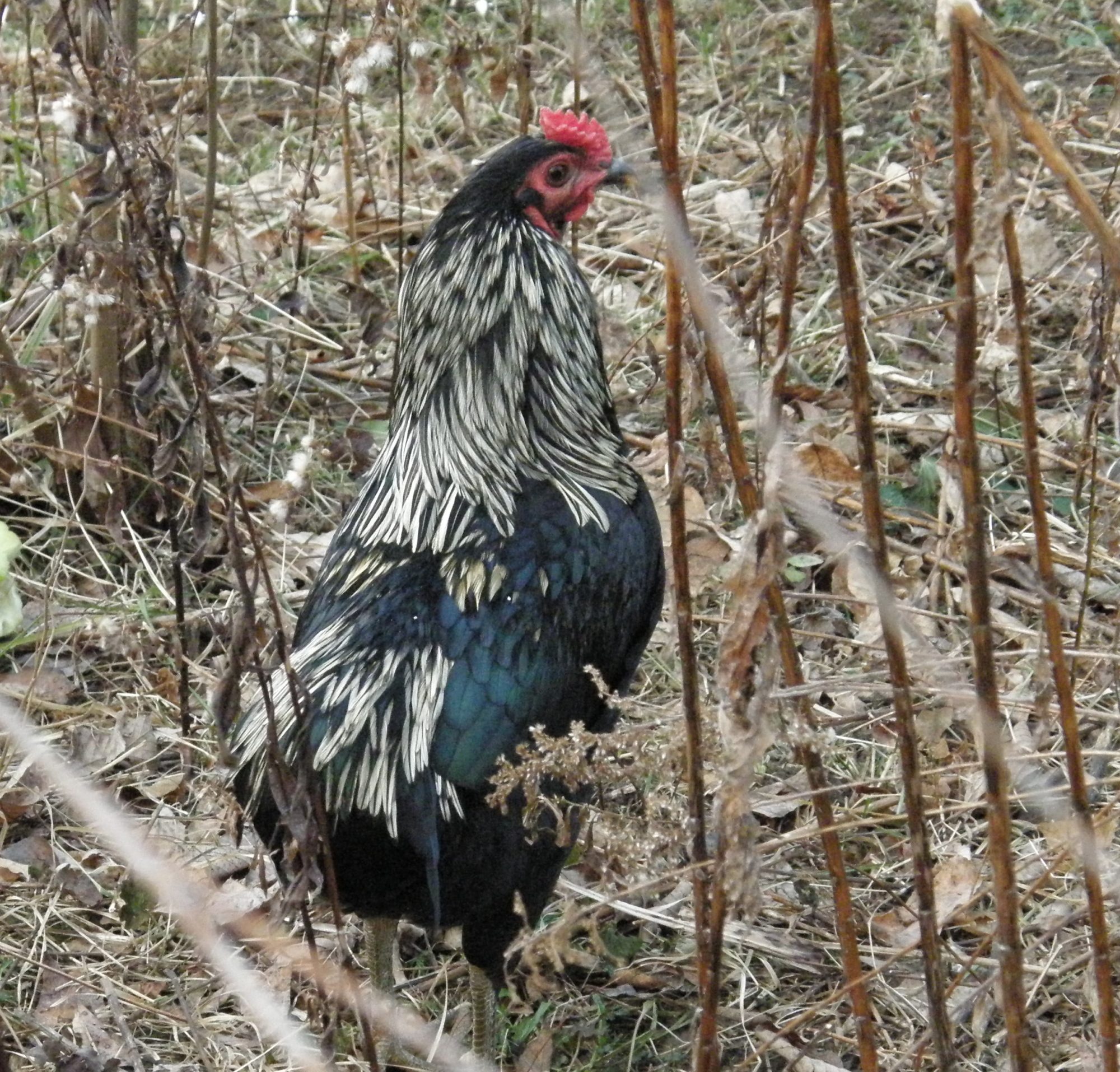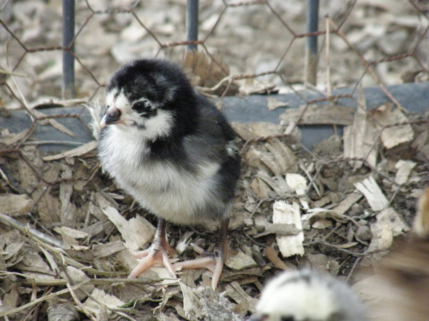 Magpie. Black (maybe split for mottled) clean-faced rumpless pullet. She's very black visually, but looks like she might have some patterning on her feathers.