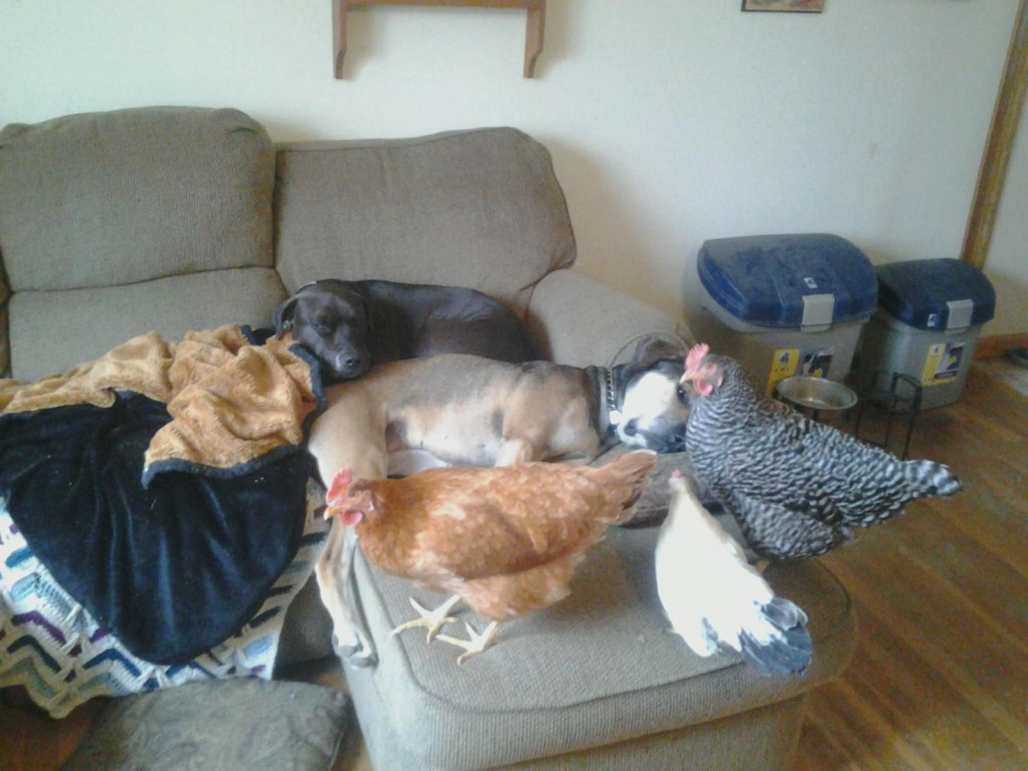 Remember, too, that chickens are pretty hardy! My Lab got a little rambunctious with the girls a few times and they pecked her to show her who was boss! She would settle right down after that.