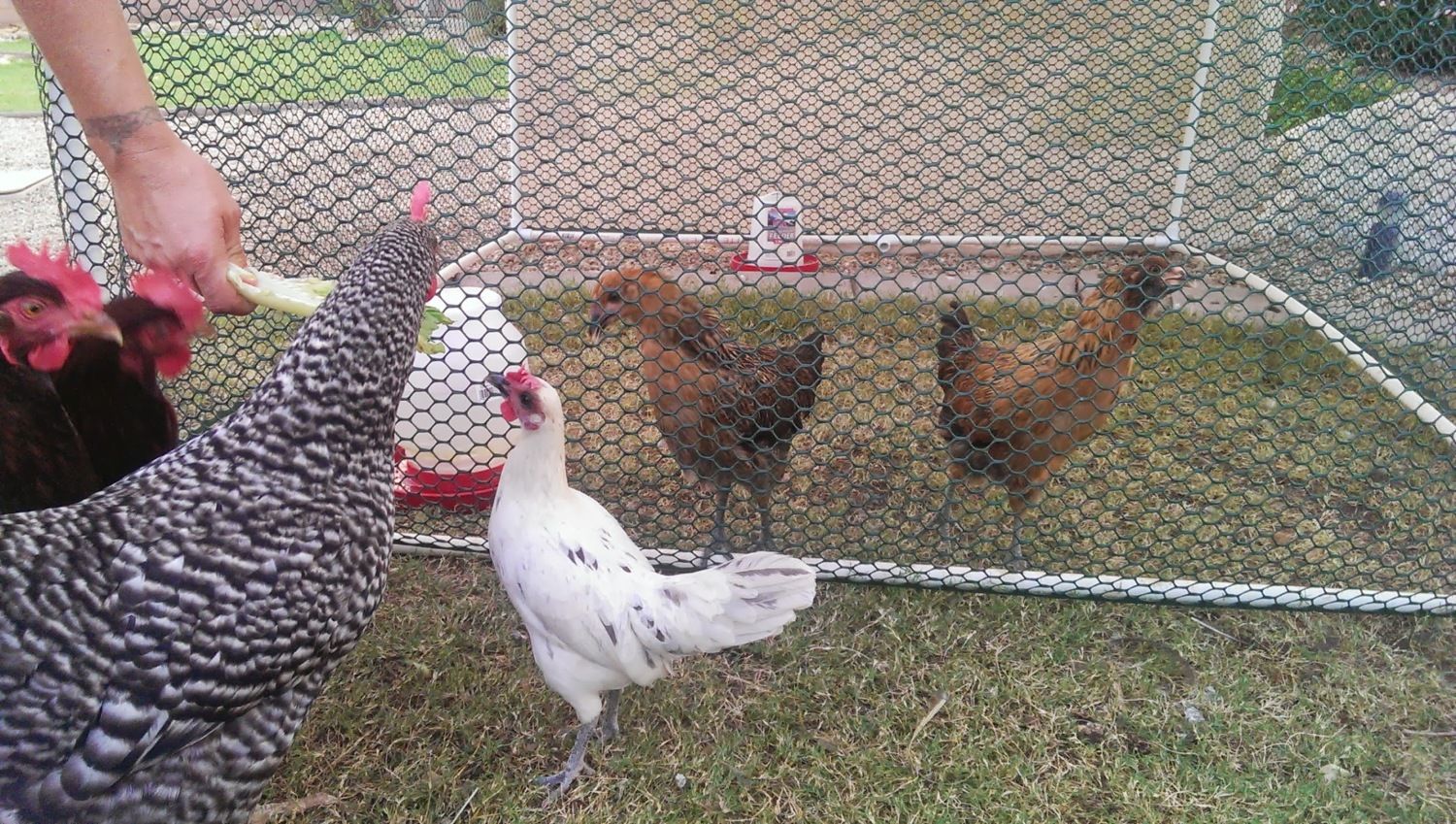 We have four chickens that are about seven months old, one of them being a Bantam. We got two more that you can see in the picture. We've had them near each other like you seen here, separated by the fencing. You can kind of see here, the new chicks are almost three months old. They're bigger than the Bantam at this point, but are they big enough to integrate?