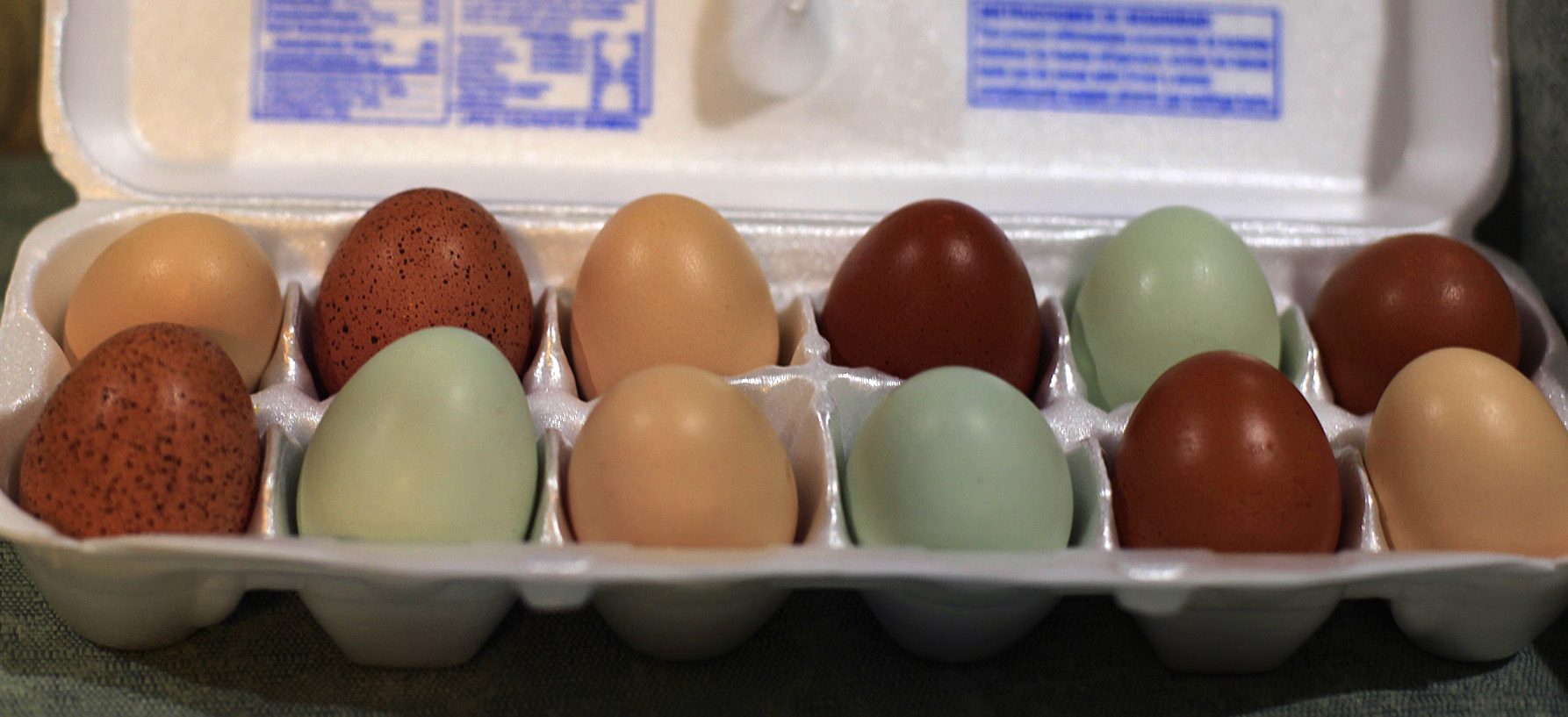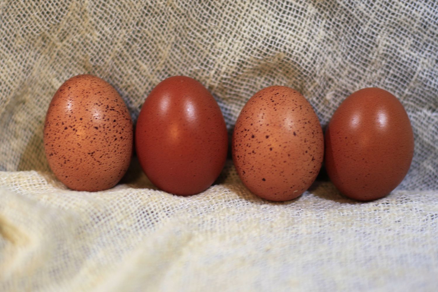 The Marans eggs are the three on the right, and I believe the 2 spotted ones are the barnevelders?? Or just the marans laying lighter eggs??