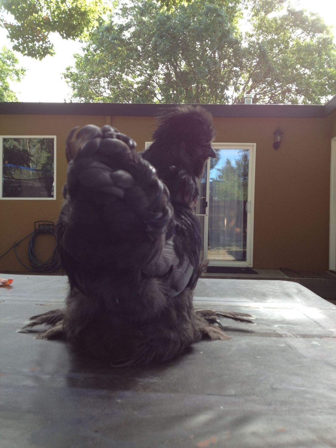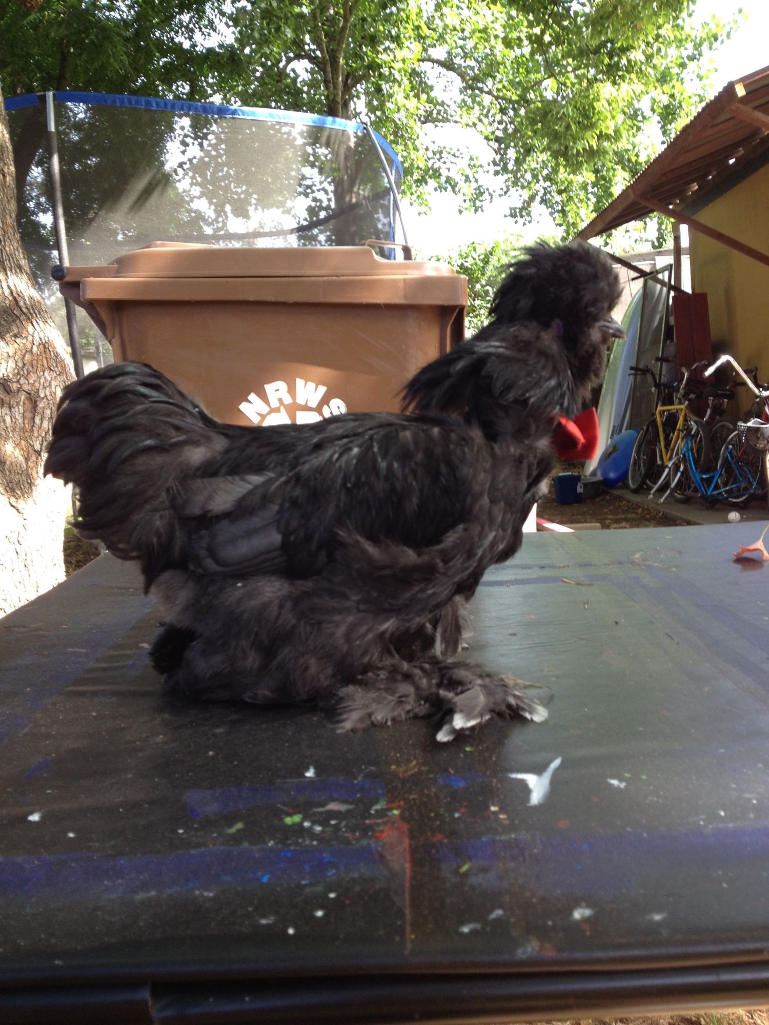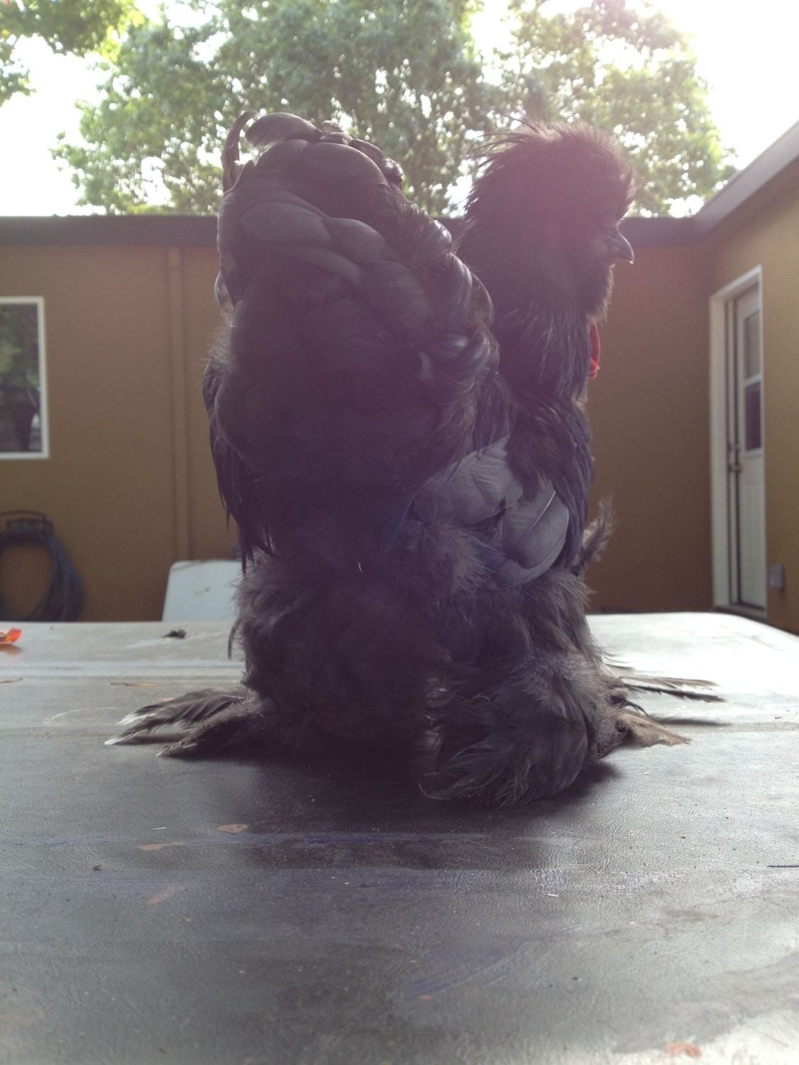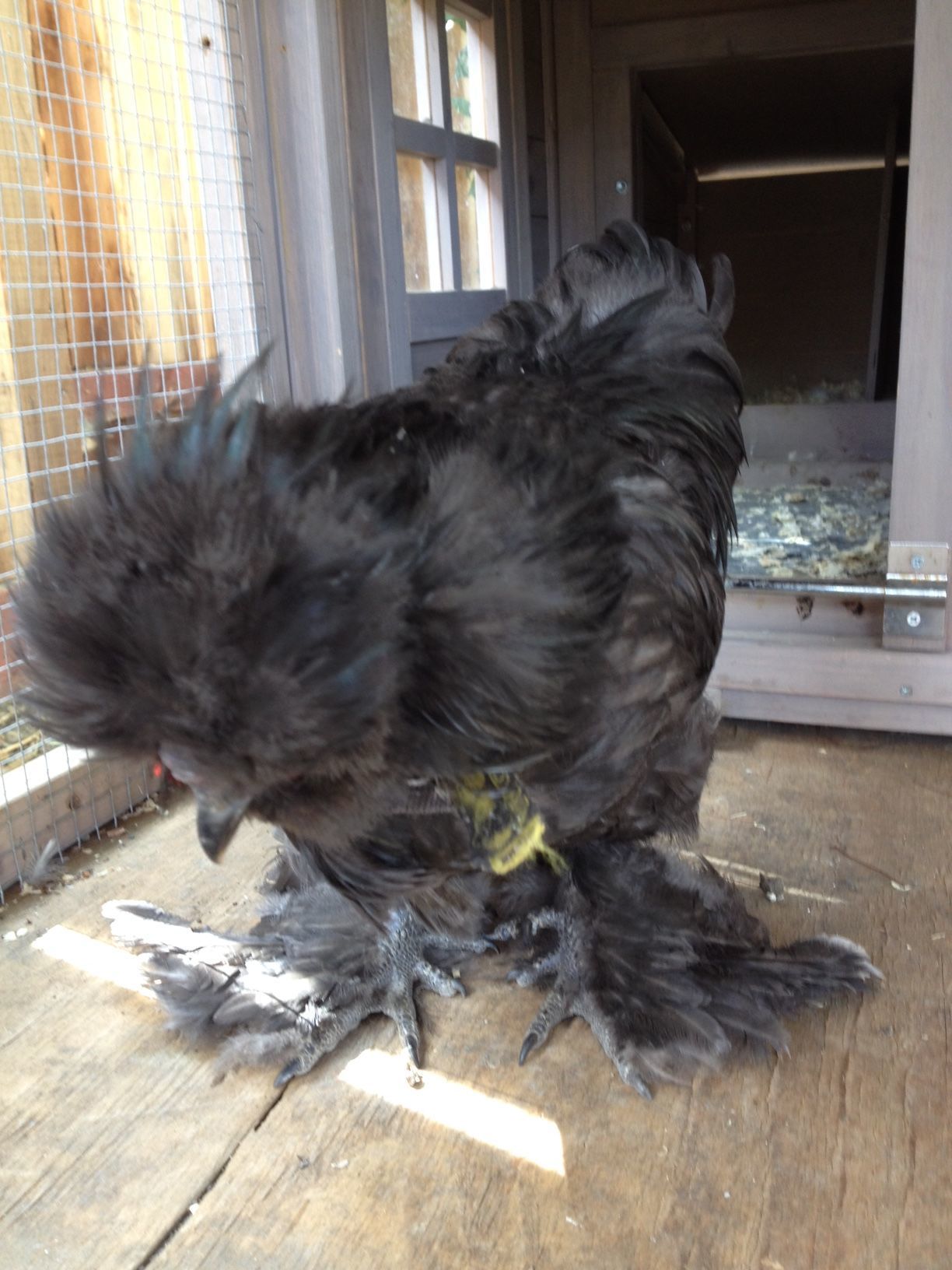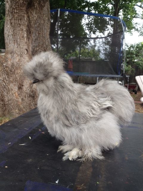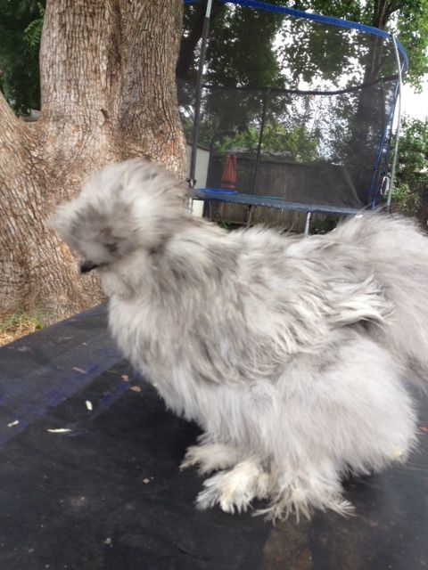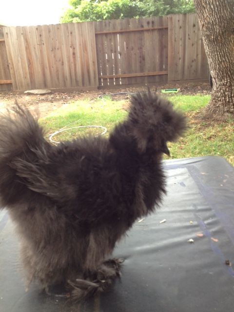 By the way, their feathers are weird because Hamlet is a smooth sizzle (I think) and Carl is a frizzled silkie. By the way, Hamlet is black and Carl is porclien.