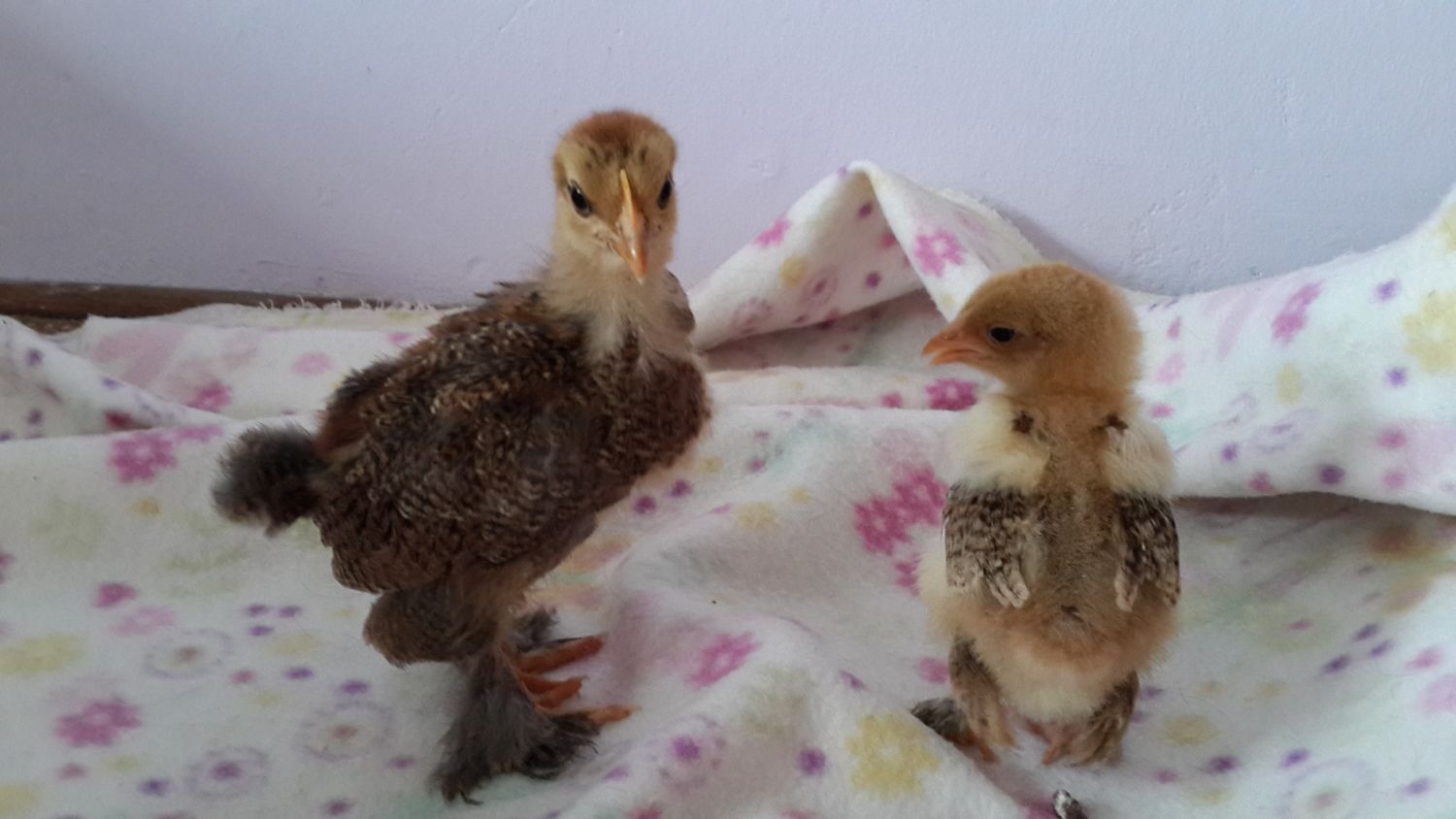 One of the hens in on the left (Dolly) and the rooster is on the right (Rusty)
