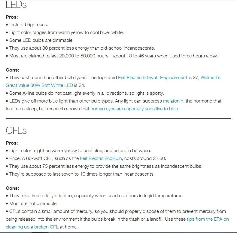 27W (100W equivalent) 1600 lumen daylight 6500k CFL vs 14W (100W equivalent) 1500 lumen daylight 5000k LED
