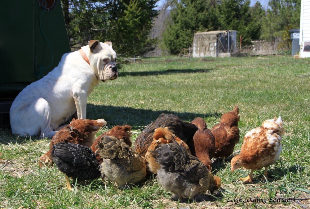 My dachshund, named knight likes to sniff and watch the chicks...
