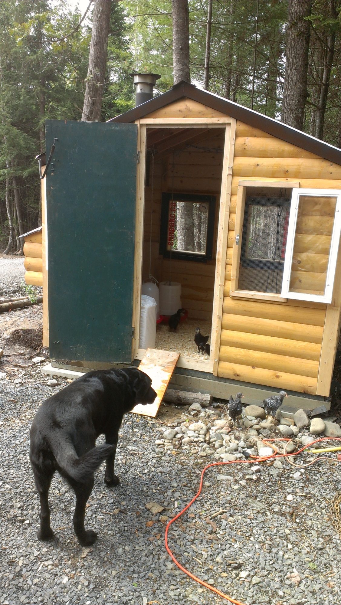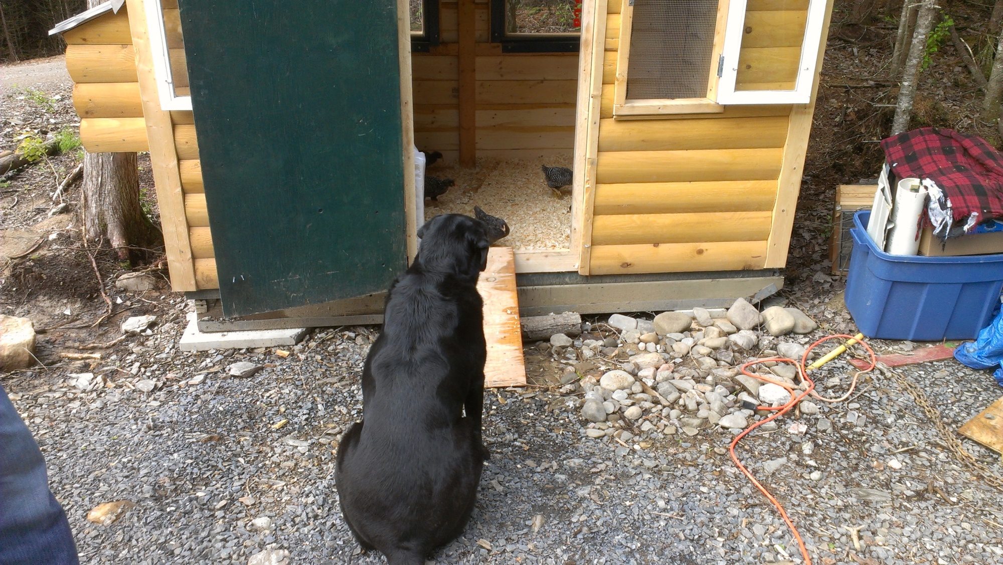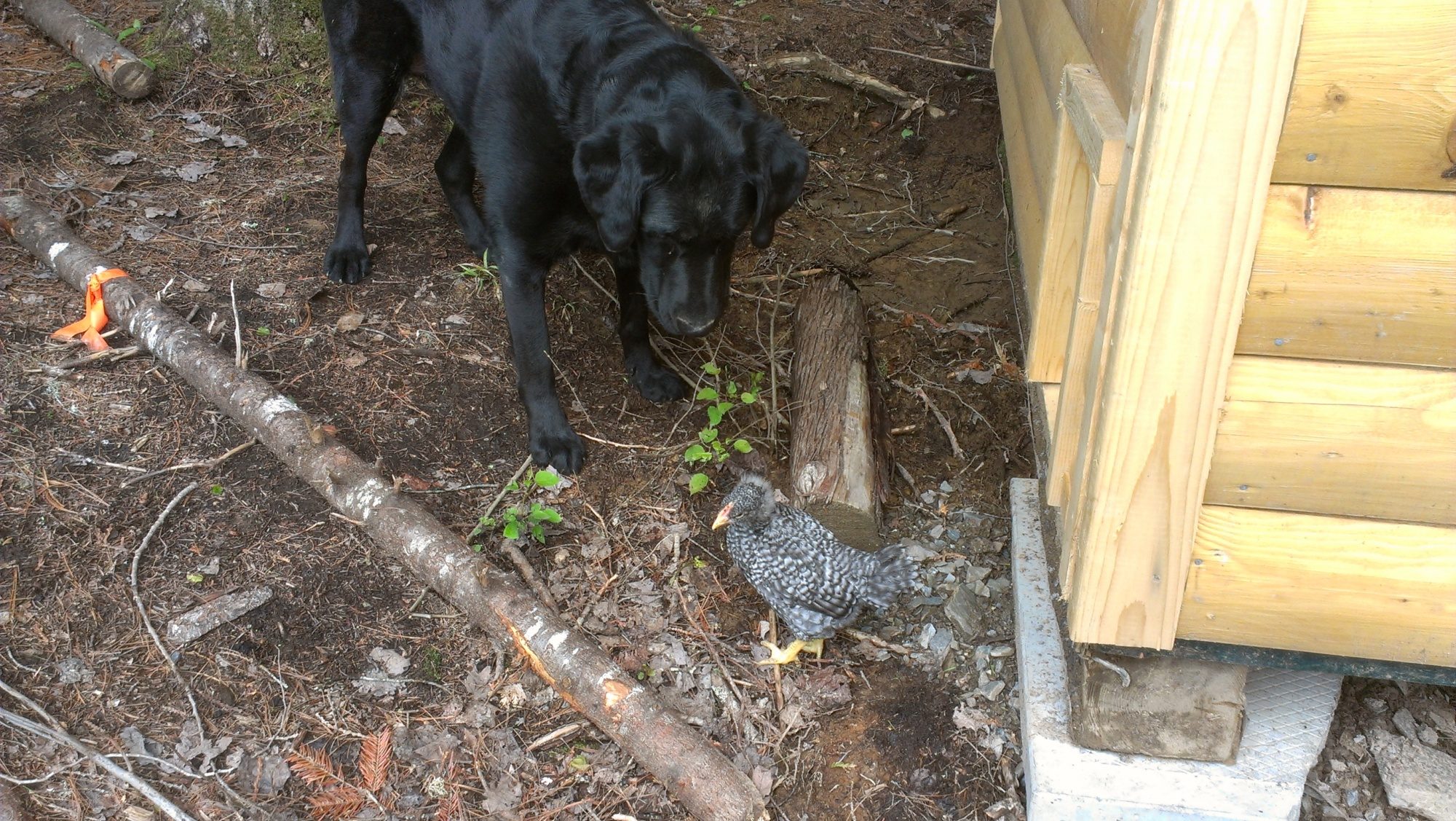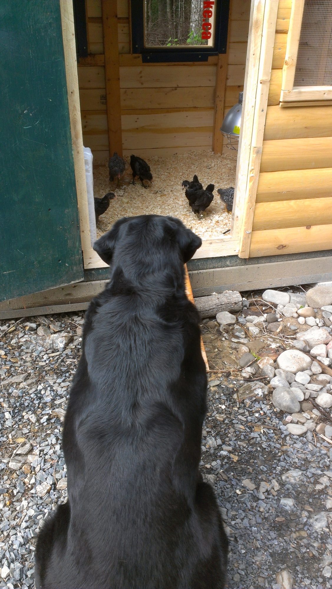 Our new flock of 13 (mostly barred rocks and americaunas) were introduced to our black lab yesterday. She's a passive dog and very well mannered. Once we exposed her to the chicks a bit and let her know that they were not dog toys, she was very friendly and curious to get to know her new neighbours. Our dog stays out during the day and I think she'll end up being great company and protection for these guys.