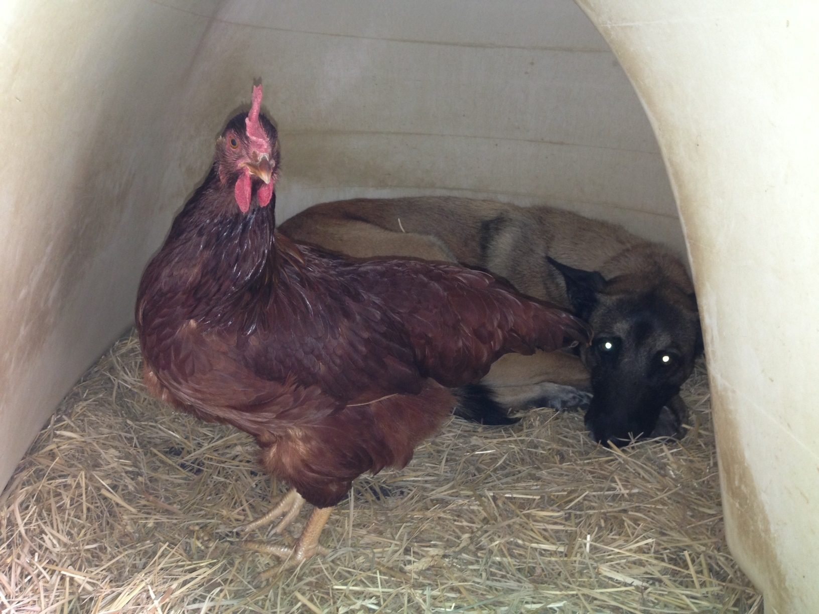 My Buster dog absolutely loves "His Girls" we can be in the other room and all I have to say is, "How's your girls?" He will run to the brooder and watch to see if anything is wrong. In fact the chair you see him setting on is a permanent fixture by the box just for him.