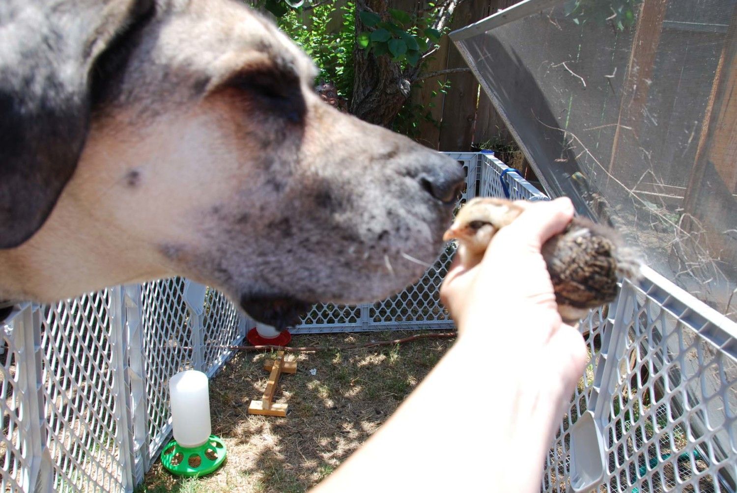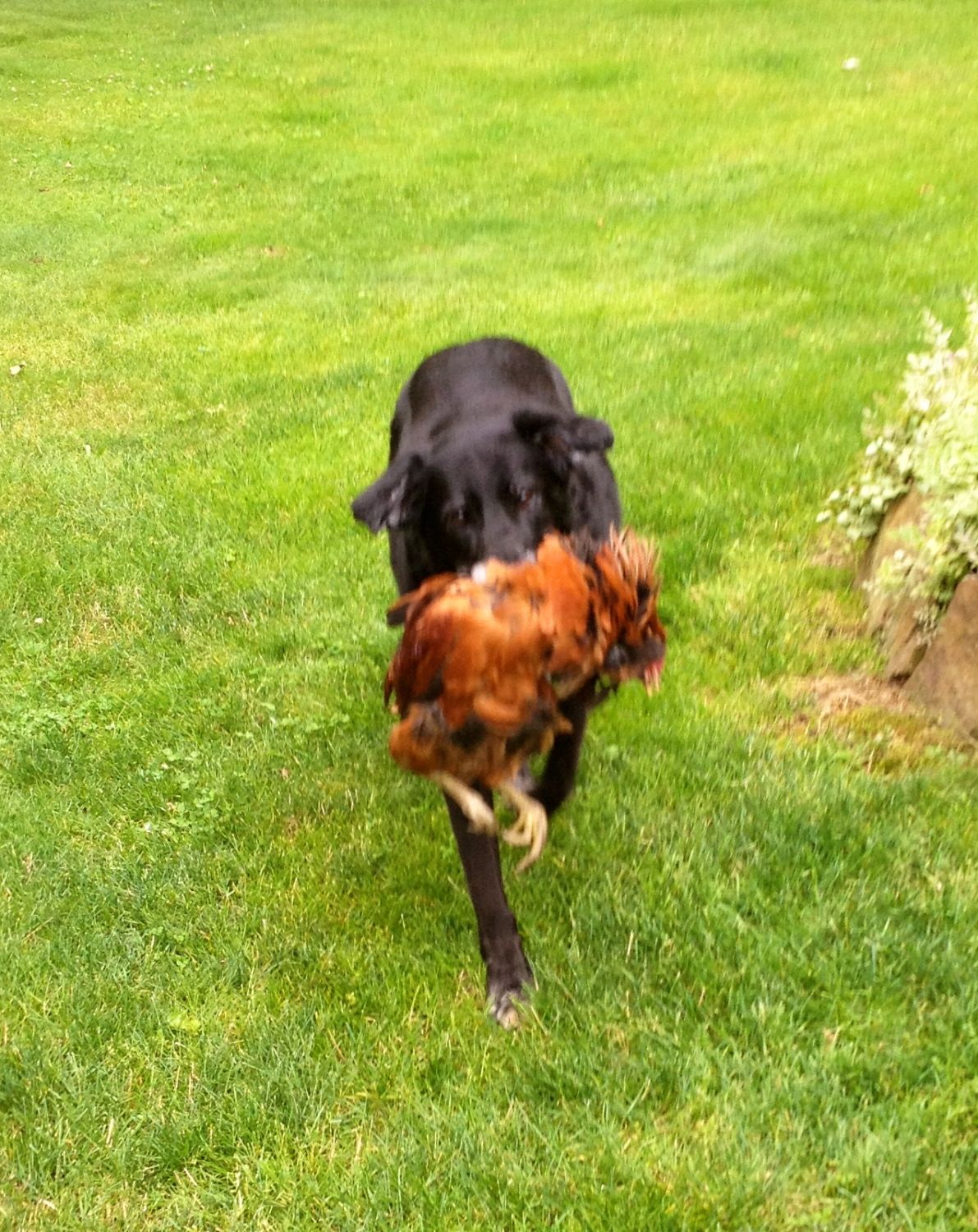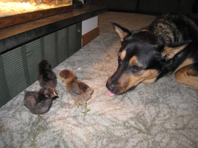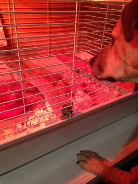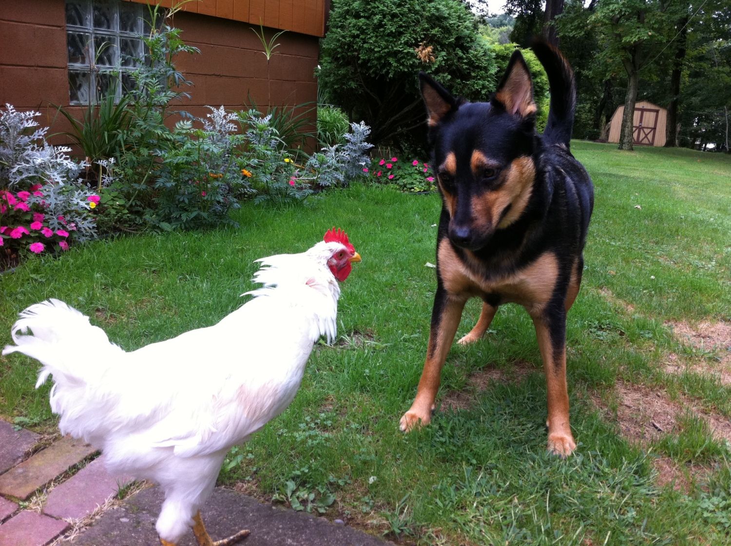"Big Momma" is a Cornish Cross left over from last year. I had a really hard time breaking Levi, our red catahoula from killing chickens. Since he was bred to hunt wild hogs it wasn't a huge shock to us but his predator drive needed to be shut down none the less. After he was sufficiently broken I decided to keep a hen around (we didn't have layers at the time) just to keep him in calm around them. It worked like a charm. They take naps together during the day and sleep in the SAME dog house at night. Big Momma has even taking to trying to 'bark' at the cows in the next pasture. I wish I had it on video. It sounds like a really angry cluck accompanied by raised neck feathers and all. When we added four layers to the flock and two roosters Levi didn't bat an eye. All the new hens and the two roos sleep together but Big Momma always goes back to the dog house to sleep next to her buddy.