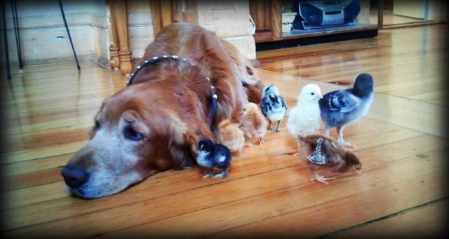 We have 2 mutts. One is a border collie and sheltie mix, the other is a chihuahua and boston terrier mix. We have had the chicks for almost 2 weeks now and both dogs just look at the chicks like they are moving chicken nuggets. The border collie mix killed one of quail years ago so I know right now she cannot be trusted. It kinda bums me out because I have to be so cautious with my boys and the chicks. The brooder is in the toy room so they are all in constant contact. I need to figure out a way to get them all to get along.