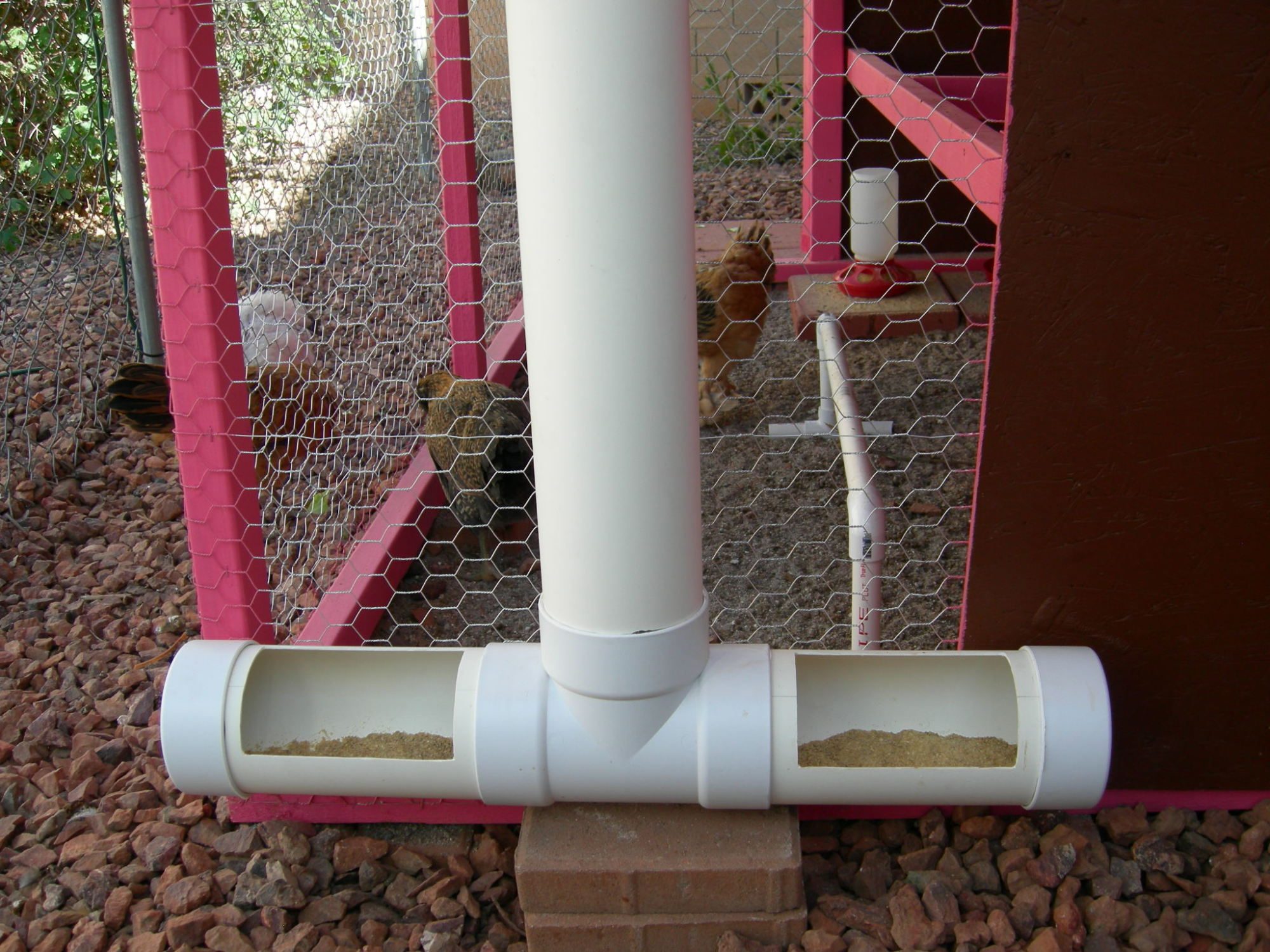 DH got our nipple watering system done. We used a 3 gallon cat little bucket and pvc pipe. I can fill the bucket from the outside of the coop but the water runs along one of the day roosts in the run. Now to teach them to use it.