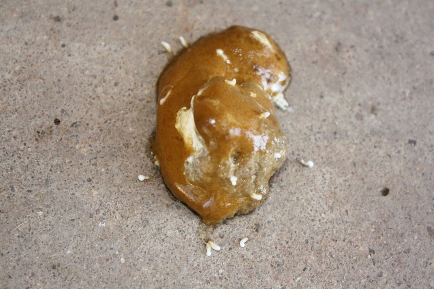 First, I found this on the patio. Please tell me something layed its eggs on this poop. I scoured the yard, found more poo, but none with worms. HELP!!