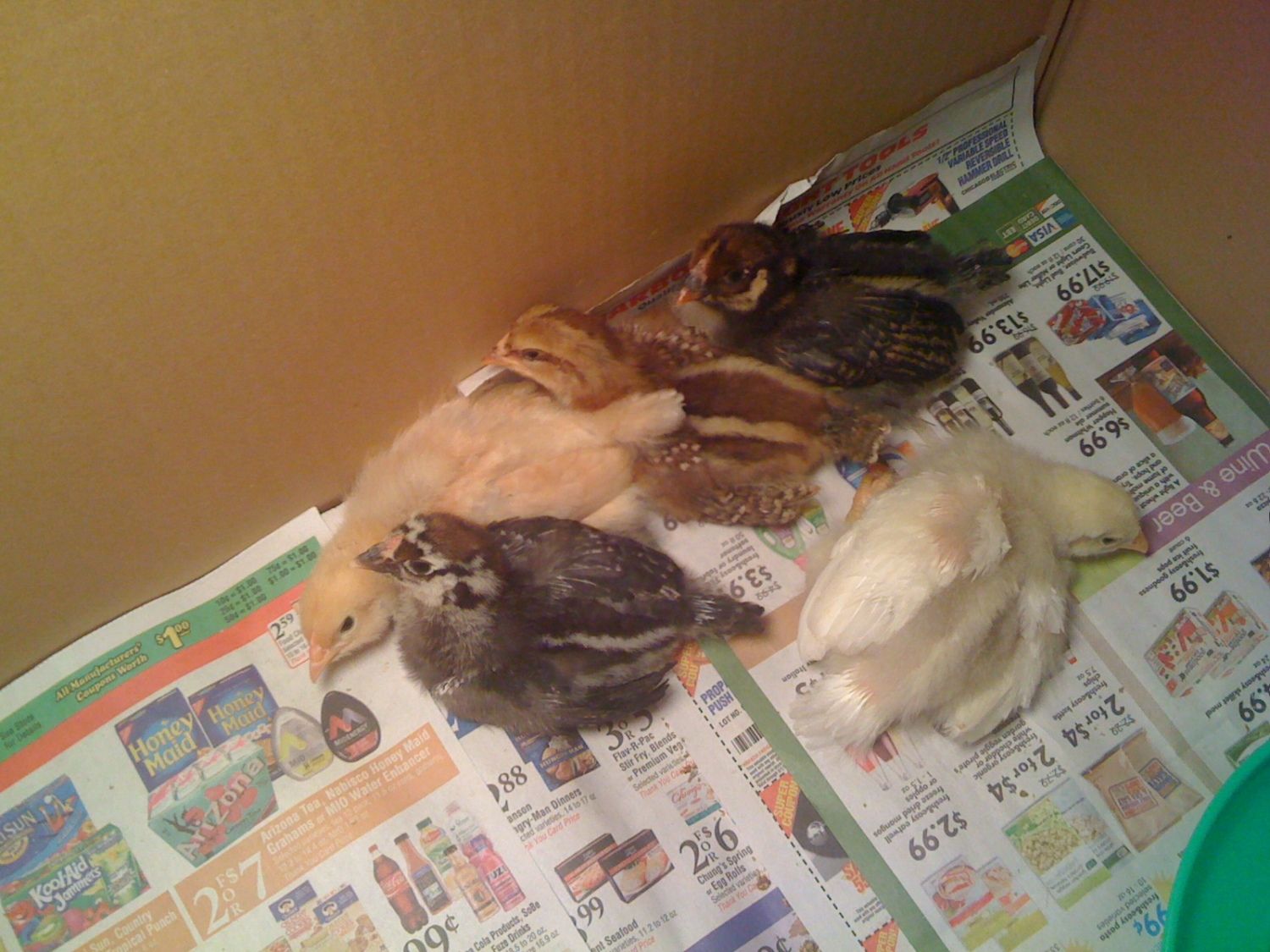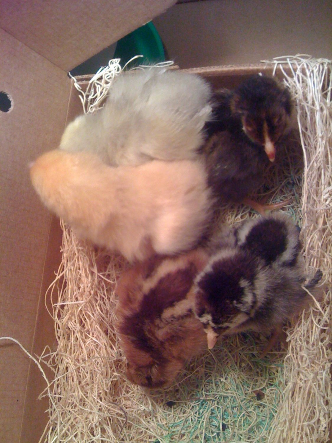 5 baby chicks in their shipping box: white rick, buff orp, gold lace wyandotte, silver lace wyandotte, and speckled sussex.