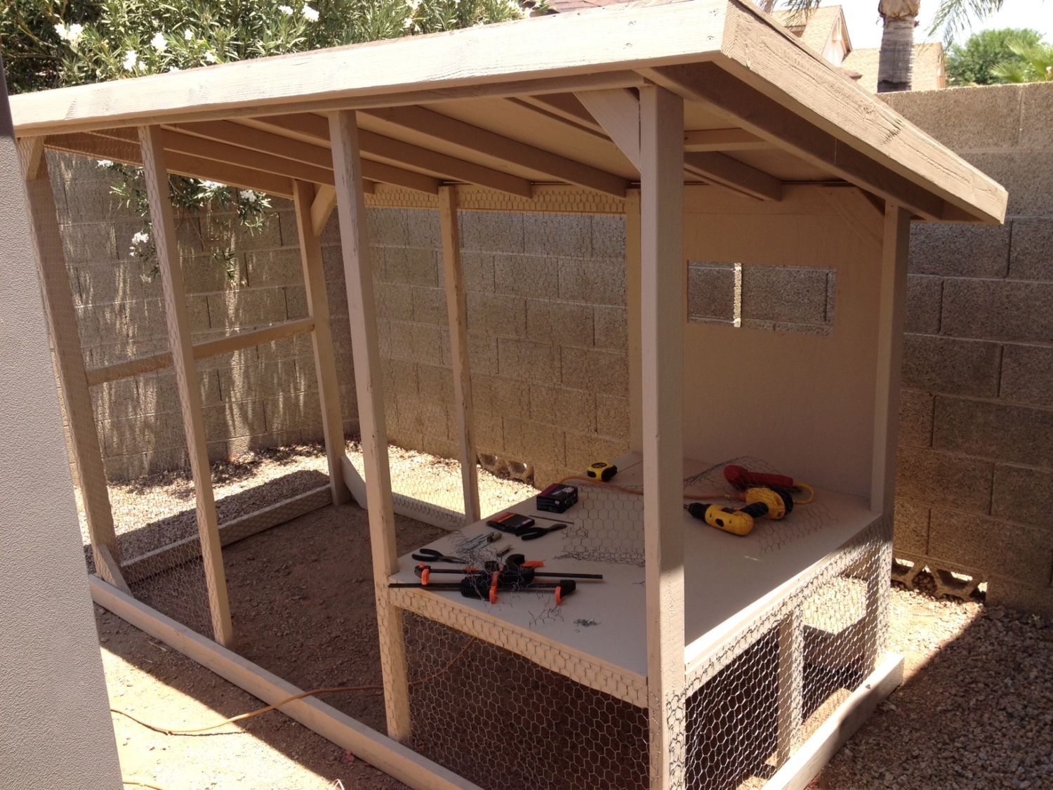 Hi, I am new to the forum but have been lurking around here for the past few months and have leared an absolute ton here! Thanks for all the info. I have been pondering getting some chickens, mainly for the hormone free eggs, and also to be pets for my 2 boys. I started building the coop about 2 weeks ago and am getting so excited to bring on the chicks! Can somone direct me to a thread link that may help me decide what kind of chicks to get that will be productive, good pets, and survive in the Gilbert heat? Also, where is a good place to buy organic, non-GMO feed preferably in the east valley? Thanks for any input and I am sure I will have a fewmore questions along the way. Here is a picture of the progress on my coop, Have a happy 4th of July!