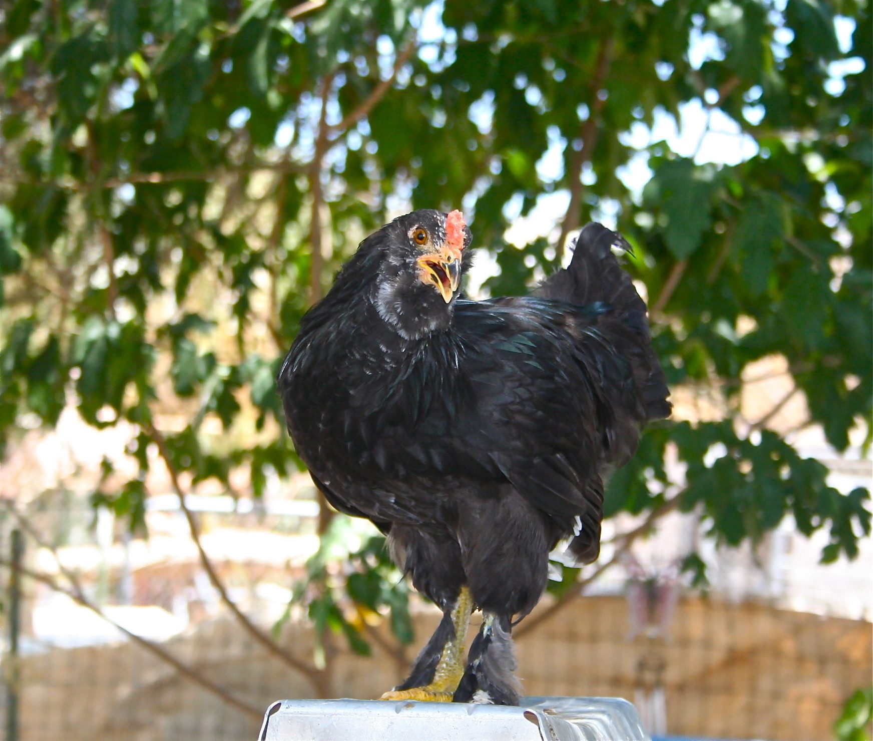 Thanks G. For the new kid in town there certainly was a lot of jumping but I don't think it was for joy! Quinn even took on a larger turkey poult and had it by the neck. I think the pigeons all came in for goodies and there wasn't much dozing. Just a few napping in the shade.Mama Hen Chris, such great pics--as always.That's awesome that Puffycheeks could take on Quinn too! When he got there, did everyone jump for joy? Did the pigeons run to him? Did everybody doze? Sorry, I just couldn't resist.