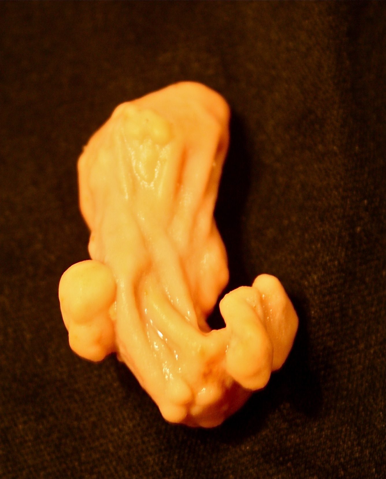 I went out to "tuck" the girls in and I see a soft shell egg broken on the floor under my Black Sex-link, Millie. ( she just turned 2 years old)Turned on the light for a better view and I see this "blob". Not sure what it is. It is 2 inches long and spongy. When I cut it open it smelled like crab. ???? It also looked like many soft shells in a clump. Millie acts "normal" for her. Eats, drinks, poops, and does all her chicky things. Not sure what to make of this. Any guesses?