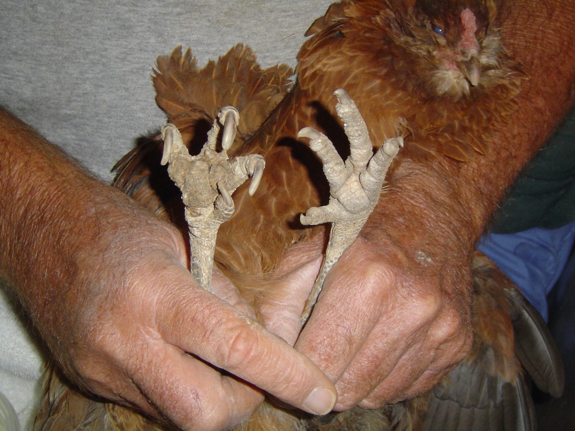 I could be wrong, as I'm very new to this, but it looks and sounds a lot like the scale mites that BeeKissed was dealing with after she got her mistreated coop back. You can read her Story of the Knarly Bunch on her blog. Chapter 8 has a great picture of the swollen feet infected with scale mites. Also, she mentioned that there is a small gland on top of their feets. It was severely clogged and I believe infected, adding to the severity of the swelling.