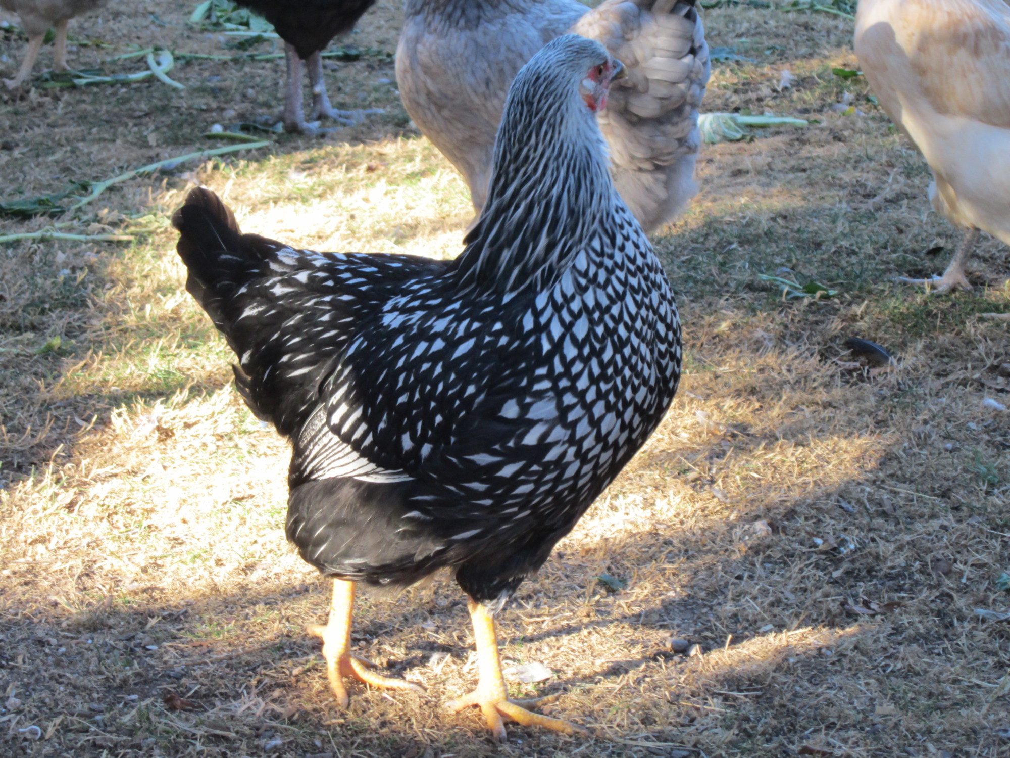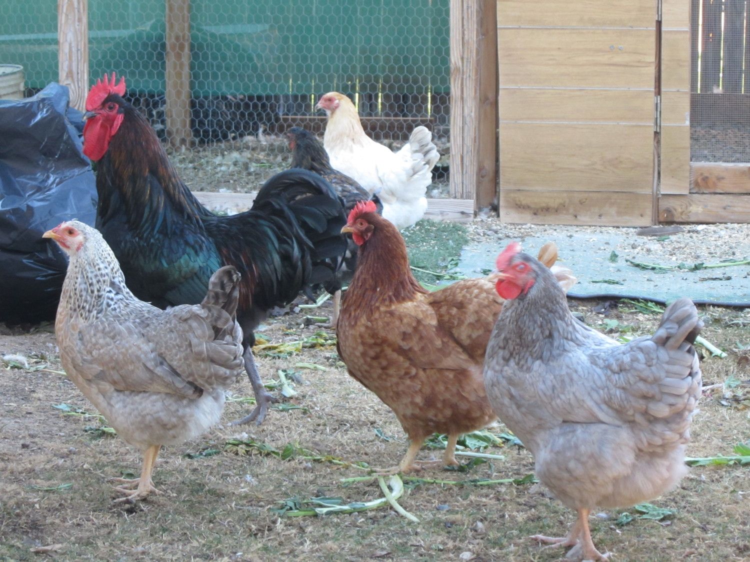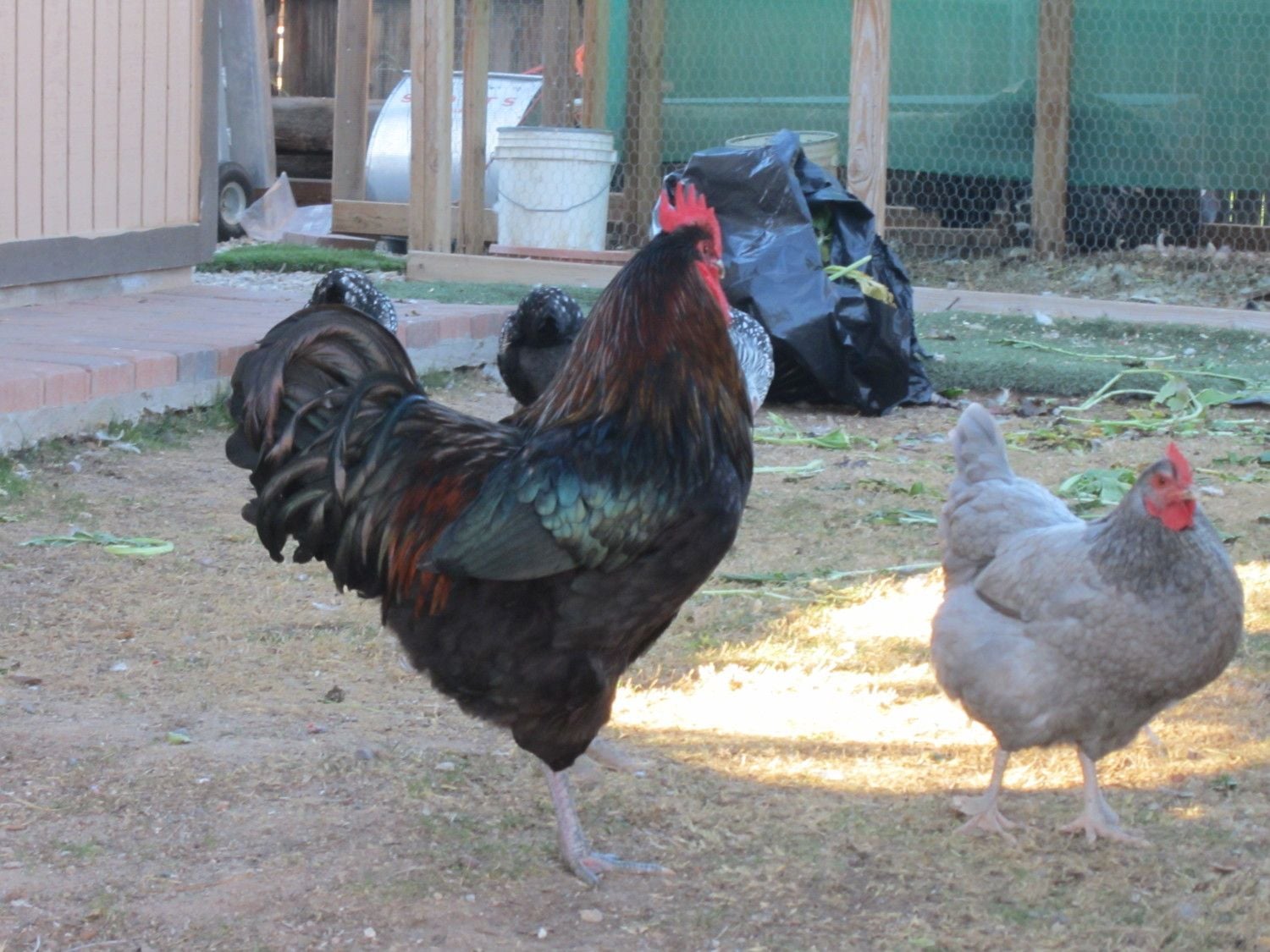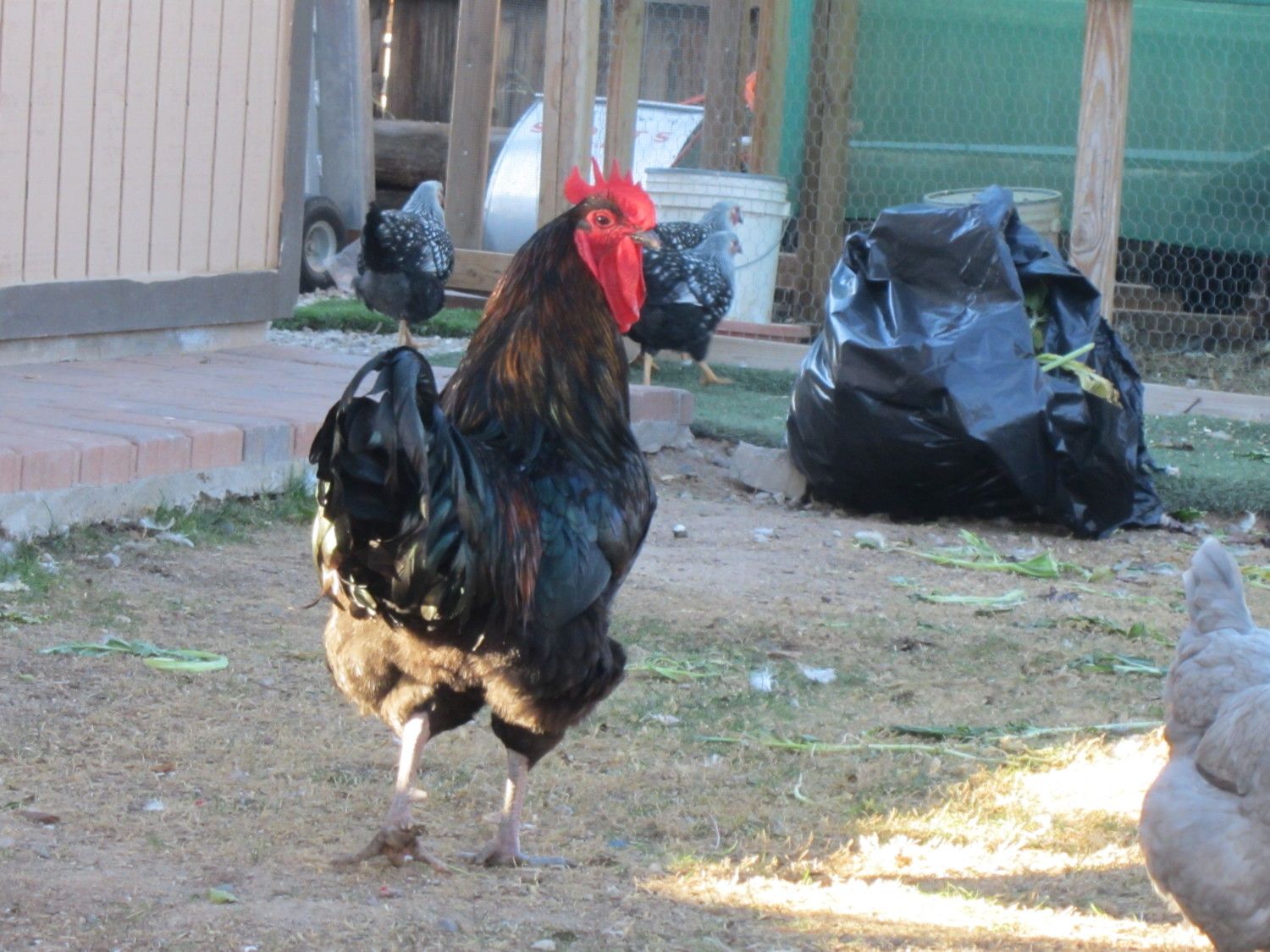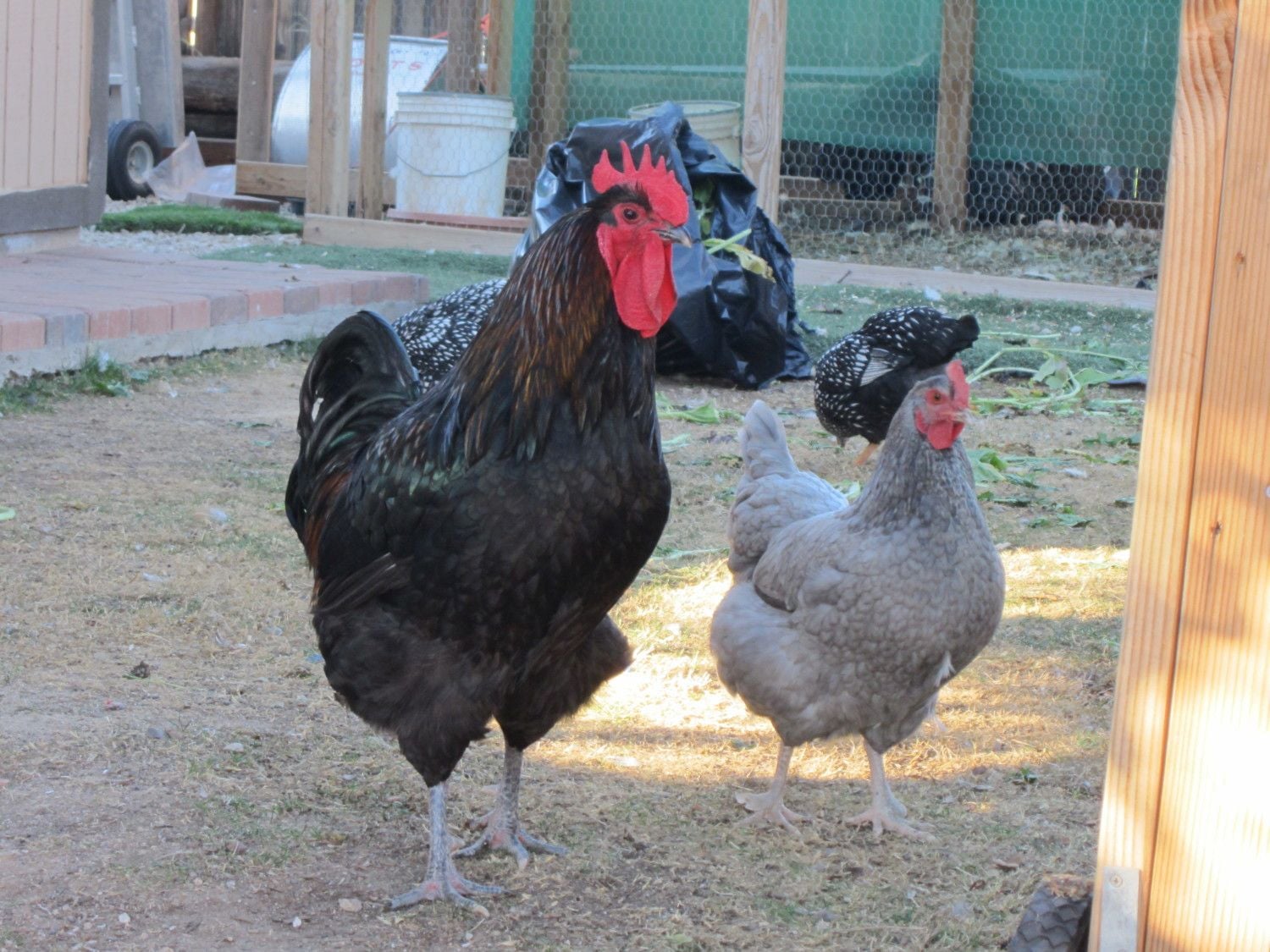 We had a crappy day yesterday. I let my birds out to free-range at 8am, as usual, while I piddled around the yard doing chores. Went in at about 8:20 to take a shower and the phone rang. I never get out of the shower to answer the phone, but something had me answering. It was my neighbor at the end of the block asking if I was missing any chickens. He had just seen two birds running across the street to the next block over. I surely didn't think they were mine, but I raced out back to check on them. What I saw was complete carnage, feathers everywhere and my poor BO, Waldo, dead on the ground. Not another bird to be found. I ran down the street and around the corner where the two birds were spotted and found my Delaware and one of my EE hiding in some dried weeds. They let me pick them up and I quickly searched for others. Went back to my house and saw my BA standing in the middle of the yard, apparently in shock and I grabbed her up and put the three into the run. It was so crushing that more than half of my flock was gone. I searched the yard again and then looked into the back alleyway, right there in front of me was a coyote, eating my other EE. It was barely bothered by my presence and only took the bird and ran away when I hopped over the wall and went after it. So, two birds were still unaccounted. For one I had high hopes, there wasn't a single feather from Mrs. Beasley anywhere. But most crushing was the massive amount of feathers and a wing from Weegee, my CM, the top bird in the flock. I searched the yard for another fifteen minutes or so and then searched the surrounding blocks and alleyways for the next hour, but finding no trace. I just killed me thinking that she could be lost out on the street. When I gave up searching and went home to look in the back yard again, right there next to the coop was Mrs. Beasley and standing right next to her was Weegee. It was one of the few times in my life I was sure that I was hallucinating because I was so certain she was dead. But I wasn't. She lost a good portion of her feathers, including most of the flight feathers from one wing (which is why I thought I saw her wing on the ground), but escaped with no other obvious wounds. So, in the end, we were fortunate that only two birds were killed. They stayed up on the roost for a couple hours, but by late afternoon, they were anxious to be let out of the run, which was not going to happen. I think the coyote came back this morning because they still have not come down off the roost.