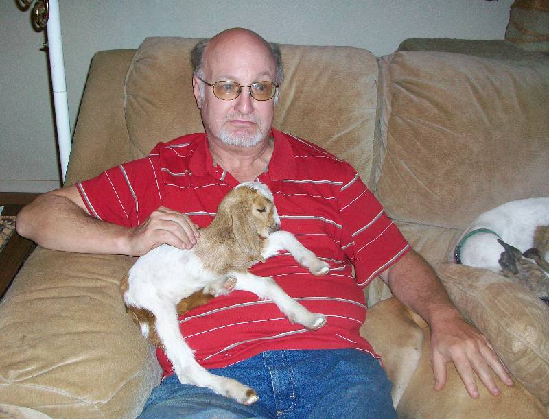 I am so happy you guys enjoy my goat pictures. I was afraid that soon I would get yelled at for putting goat pix up in a chicken forum! LOL The little goat with the most white has been spending a few nights in my bedroom in a kennel. She is weaker that her sister and needs extra feedings. Was up every two-three hours feeding a very reluctant baby. Ended up having to syringe food into her instead of using a bottle. She spent the day with her mother and was much stronger. I hope she feeds better for me tonight. Picture is of Les my DH giving her some cuddling before bed time. Her name is Jewel and her sister Pearl is doing great.