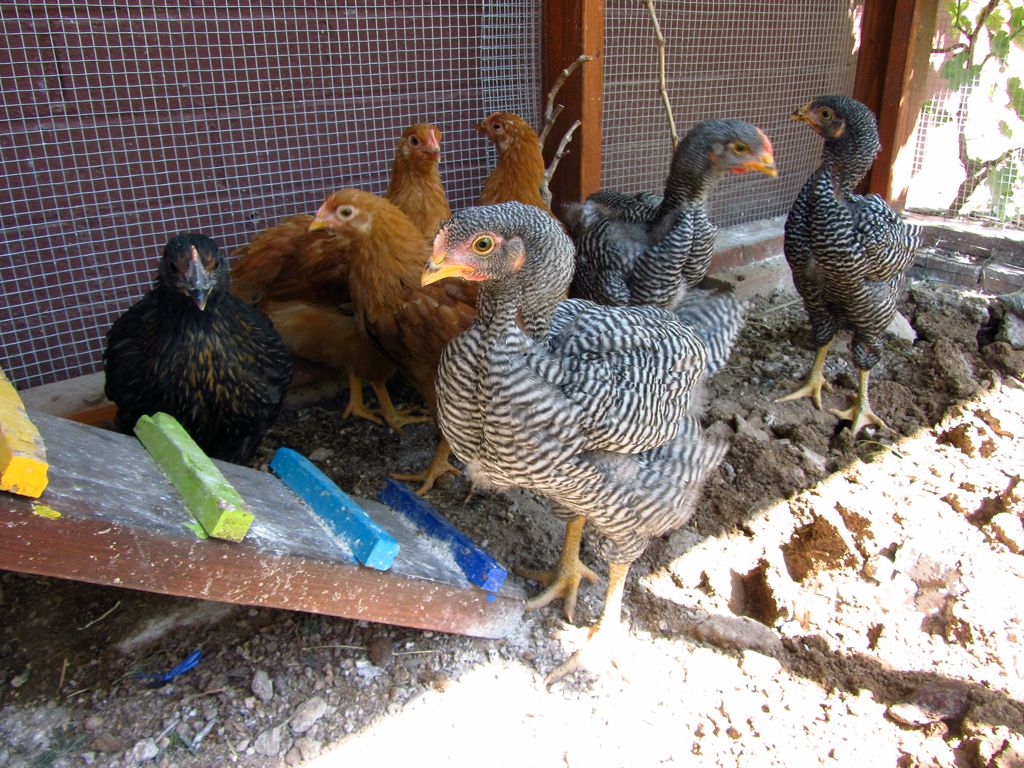 The chickens are 7 weeks old, it's time to force you guys to look at more pictures! There are 3 New Hampshires (a German line), 3 Barred Rocks (Good Shepard line), and 1 Black Sex Link. All from desertmarcia.